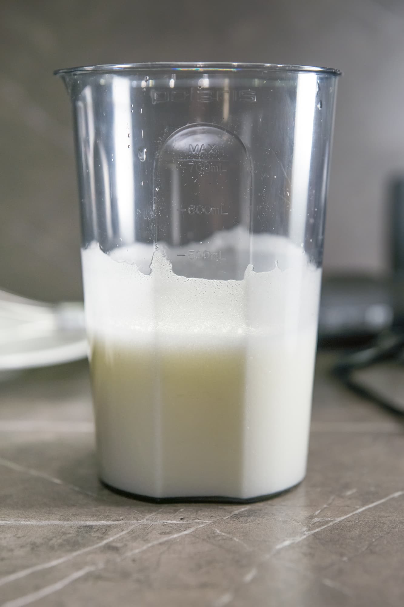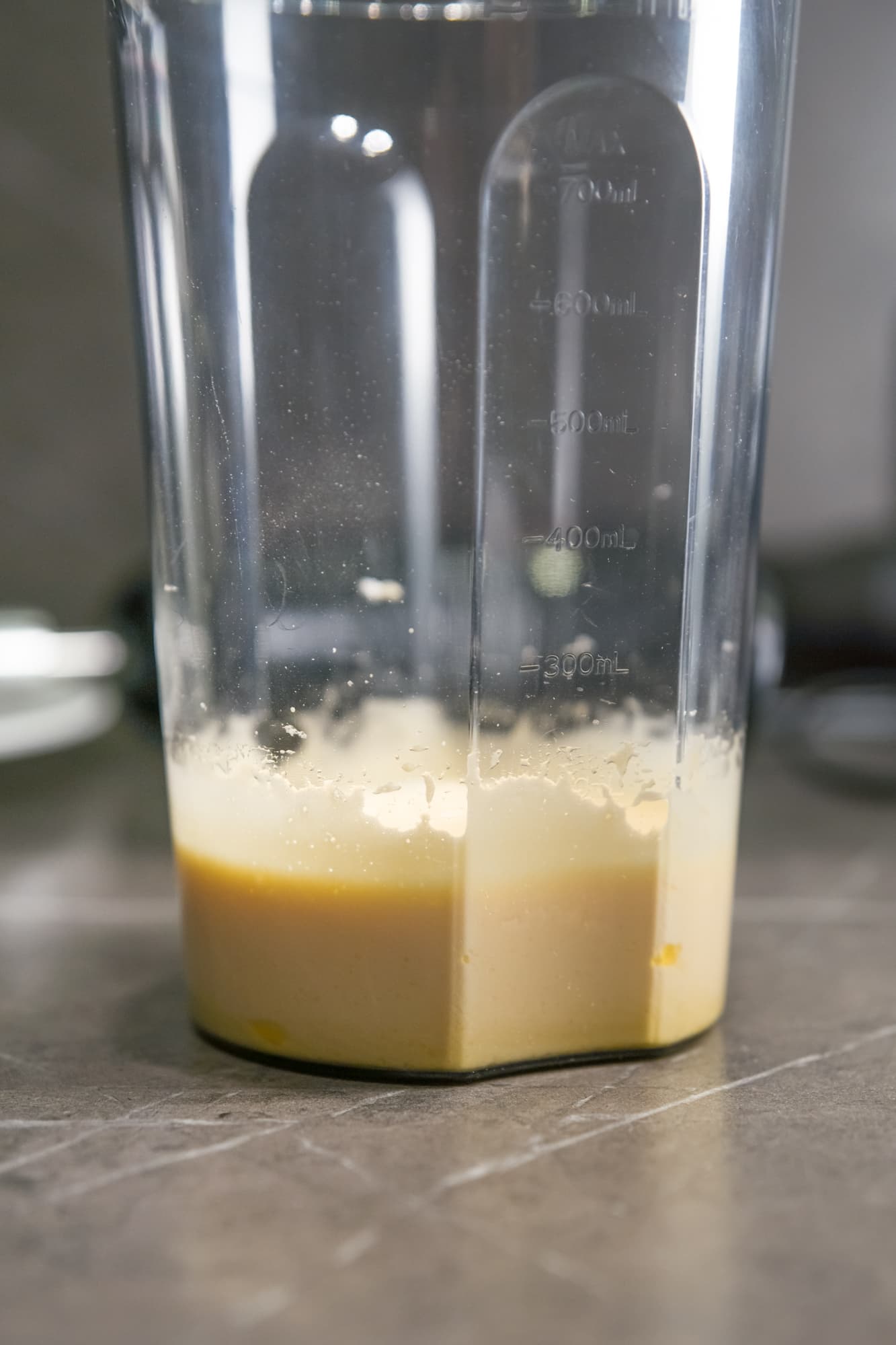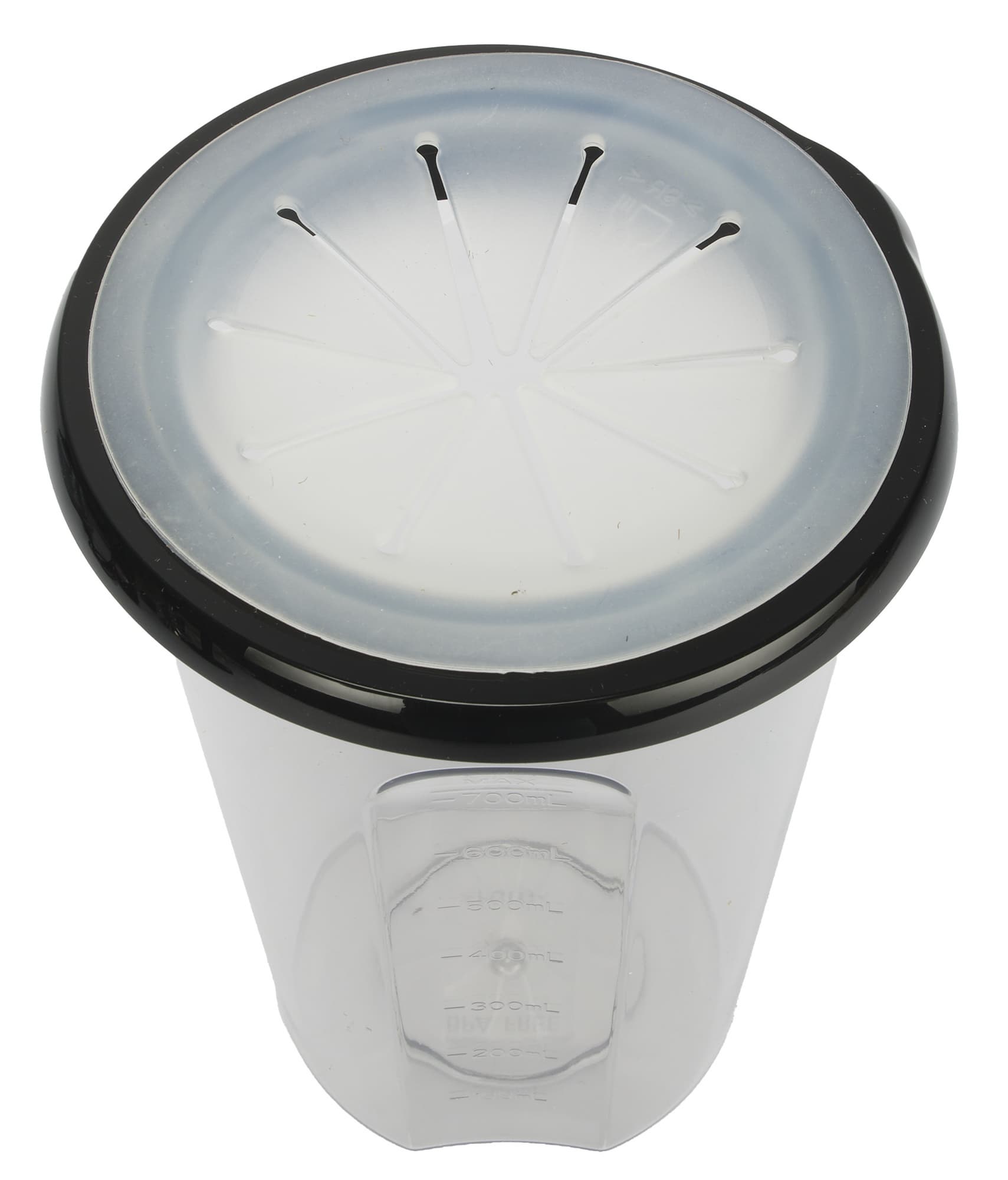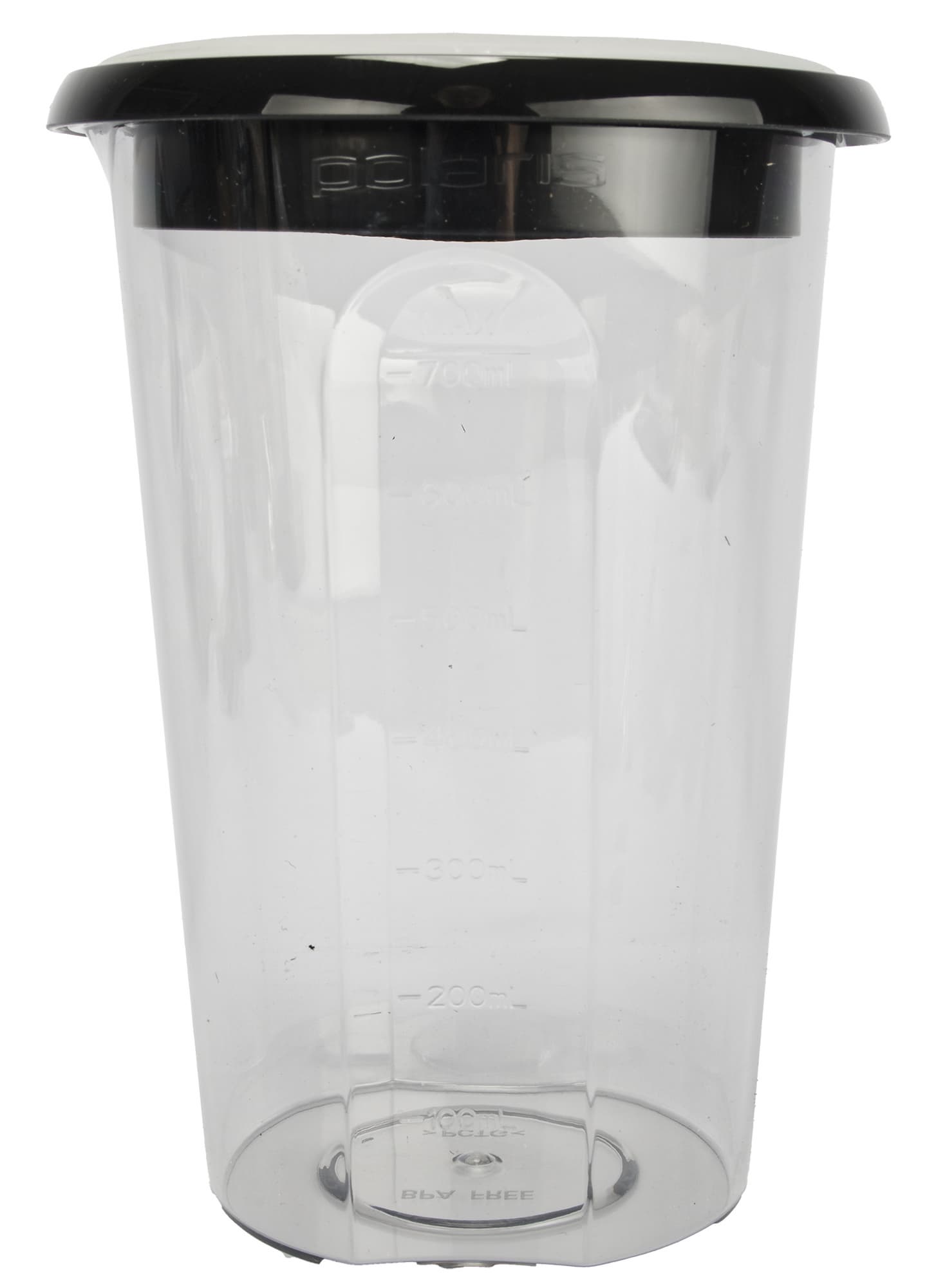 Стакан для смешивания с рабочим объемом 700 мл изготовлен из пластика. На вид и на ощупь материал не производит впечатление хрупкого. На лицевой стороне есть отметки со 100 до 700 мл с шагом 100 мл. Форма стакана очень удобная, он не выскальзывает из рук, а для аккуратного выливания жидкости предусмотрен носик.