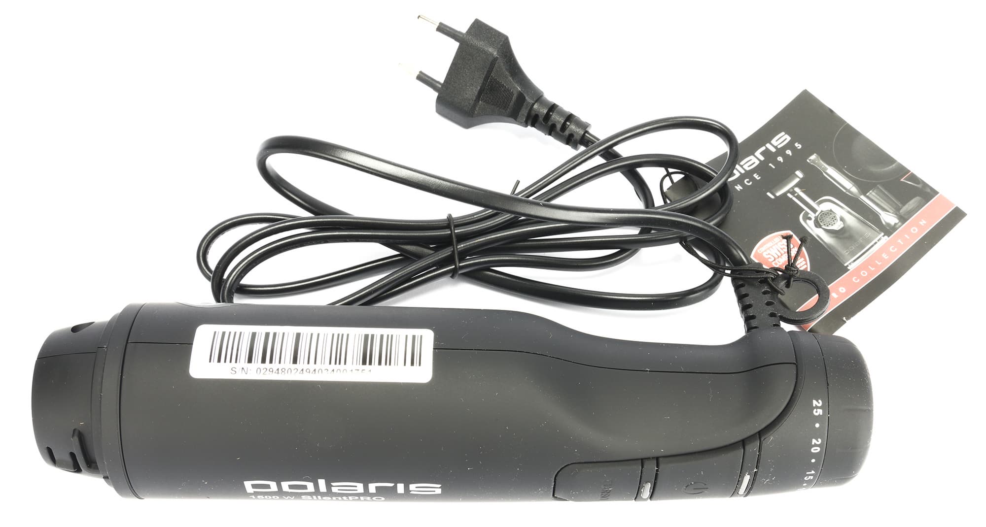 С лицевой стороны на корпус краской нанесены: логотип бренда, надпись, указывающая на принадлежность к серии Silent Pro и мощность прибора. С обратной стороны — пиктограммы, иллюстрирующие серию Pro Collection, к которой также относится и наш прибор. По окружности моторного блока есть наклейки со штрих-кодом, техническими характеристиками и информацией о двойной защите двигателя. Они снимаются легко и не оставляют на поверхности клеевого следа.