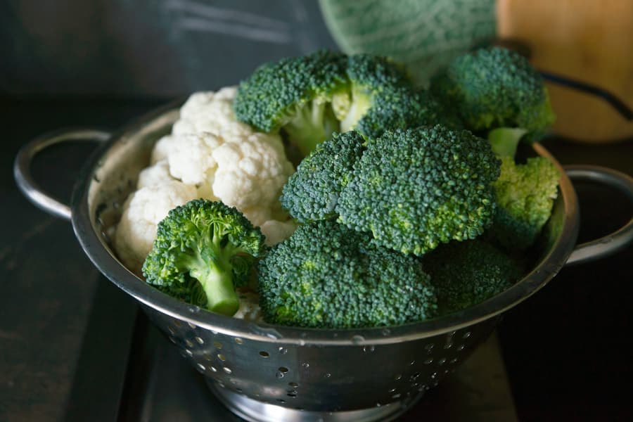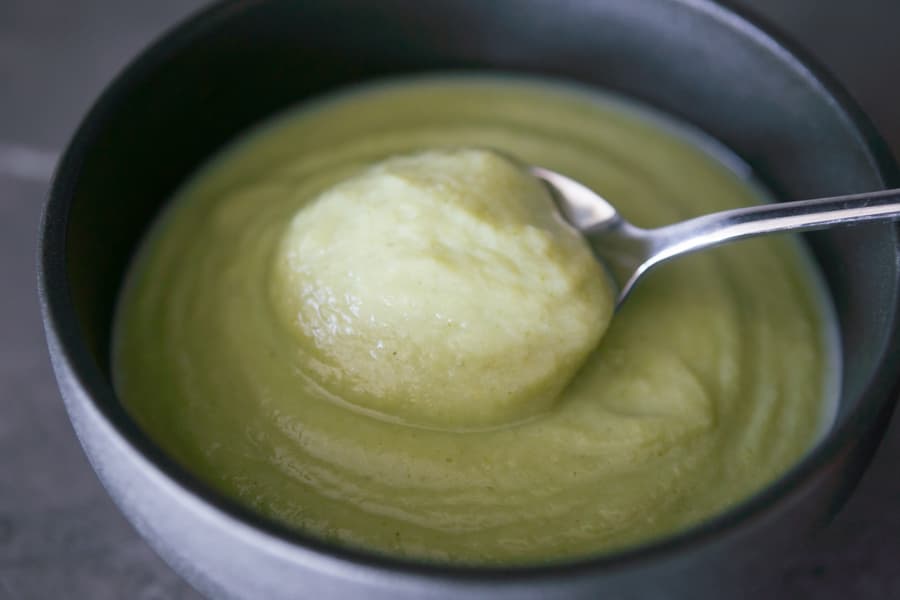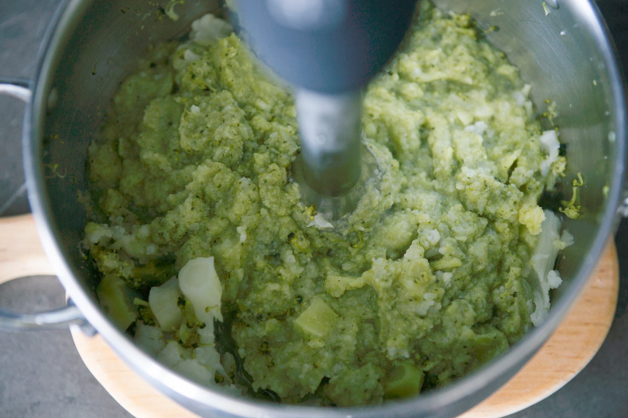 Для этого супа мы предварительно отварили до полной готовности брокколи, цветную капусту и пару картофелин. Затем слили из кастрюли почти всю жидкость, дали овощам немного остыть и вооружились погружным блендером. Измельчение овощей на 25-й скорости заняло 2,5 минуты с короткими остановками на подсаливание супа и подливание теплых сливок.