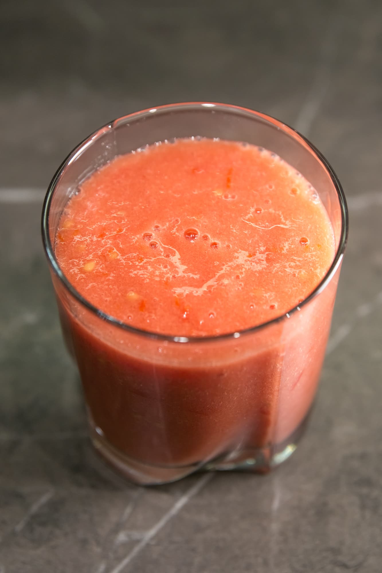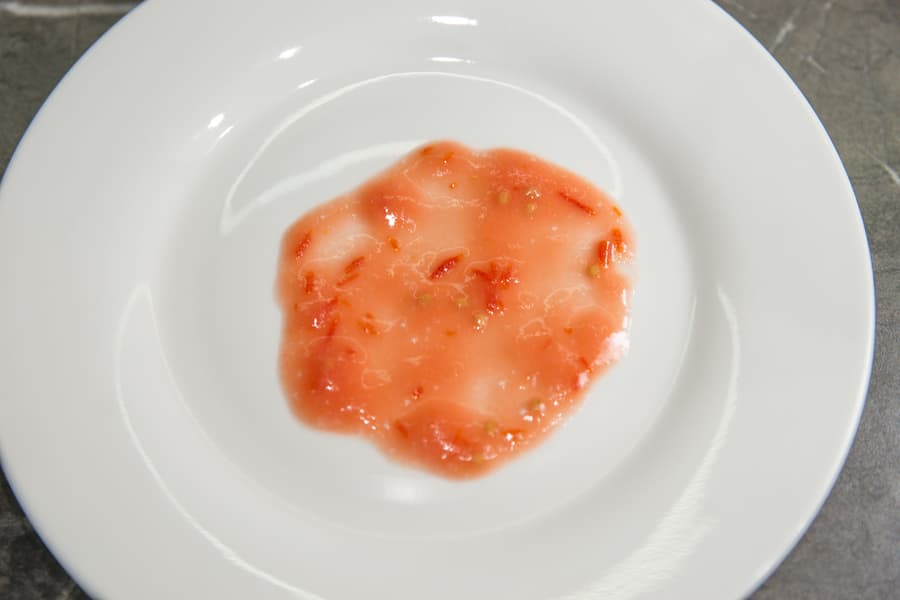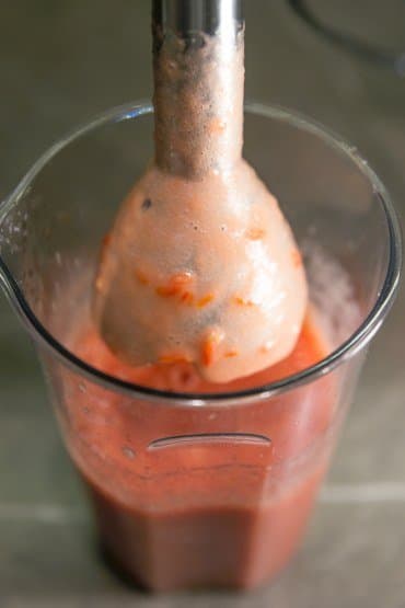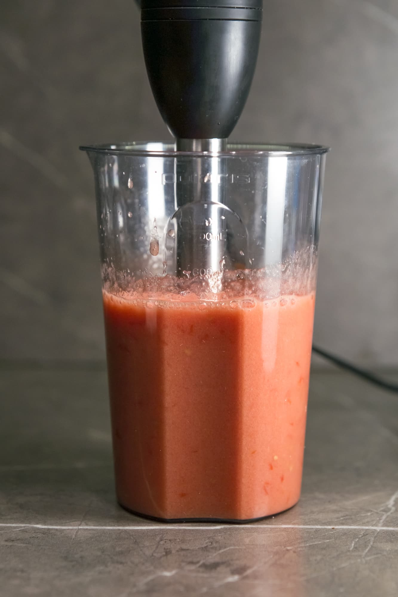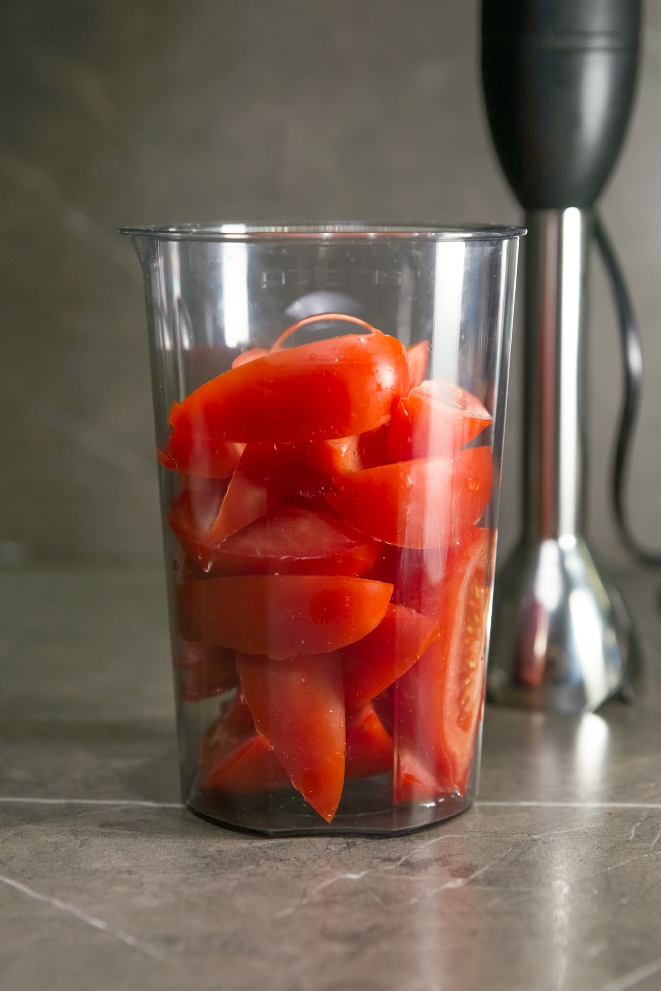 Несколько помидоров сорта «сливка» нарезали на четвертинки и сложили в стакан для смешивания. До отметки 500 мл поместилось чуть более 400 г. 30 секунд работали блендером на 15-й скорости. За это время у нас получилось неплохое воздушное томатное пюре, но в нем еще были заметны большие кусочки шкурки и семена.