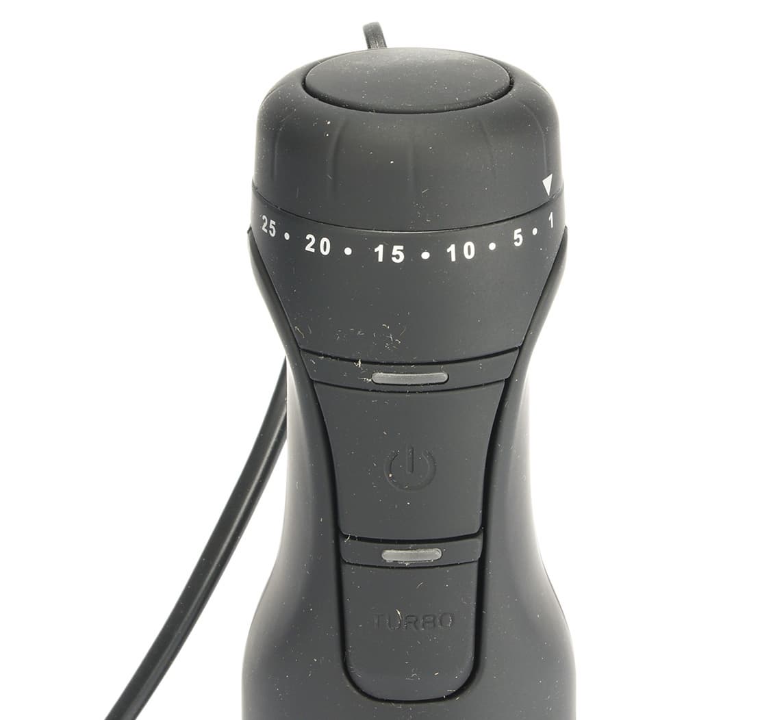 С управлением все просто: после подключения к сети регулируем колесиком скорость вращения ножей (с 1 по 25), для запуска зажимаем кнопку включения. Без выбора скорости можно сразу запустить максимальную скорость — для этого нажимаем и удерживаем кнопку Turbo. Световых индикаторов у этой модели нет.