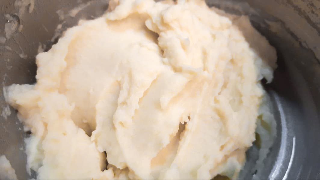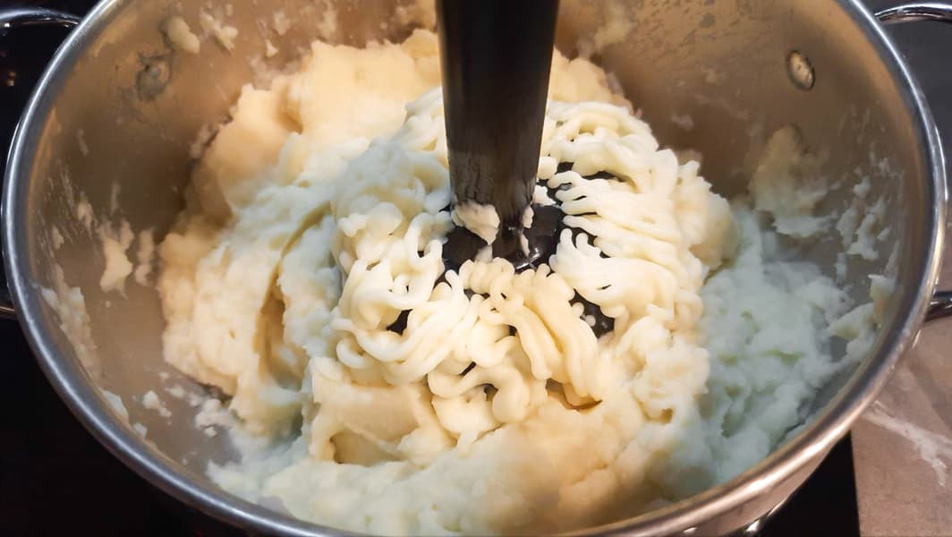 Сварили картофель в подсоленной воде. Слили воду, добавили немного сливочного масла, теплого молока и включили электротолкушку. Чтобы не получить клейстер вместо вкусного пюре, работали на 10-й скорости.
