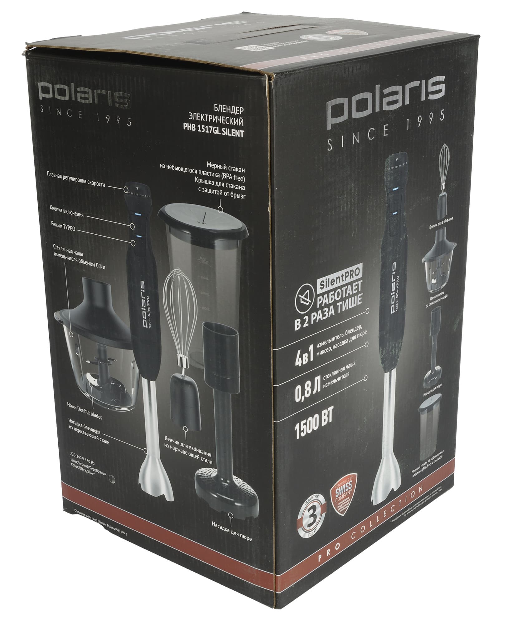 На гранях стильной (как всегда, у Polaris) упаковки мы видим изображение самого прибора, дополнительных насадок и прочих комплектующих, а также информацию о гарантии, технические характеристики и напоминание о технологии Silent Pro, обеспечивающей тихую работу устройства.