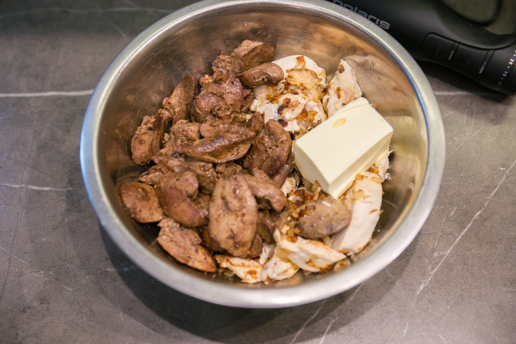 Для этого теста мы взяли жареную куриную печень с луком, отварную куриную грудку, кусок сливочного масла, щепотку молотого мускатного ореха и немного сливок.