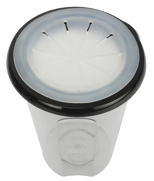 Крышка-редуктор стандартной формы прилегает к чаше хорошо, но не имеет никакой дополнительной фиксации, кроме собственного веса и уплотнительного силиконового кольца, закрепленного изнутри. Для тщательной очистки оно легко снимается. Забегая вперед, во время работы блендера чаша крепко сидит на своем месте, но на всякий случай, при измельчении в режиме Turbo мы ее все-таки придерживали свободной рукой.