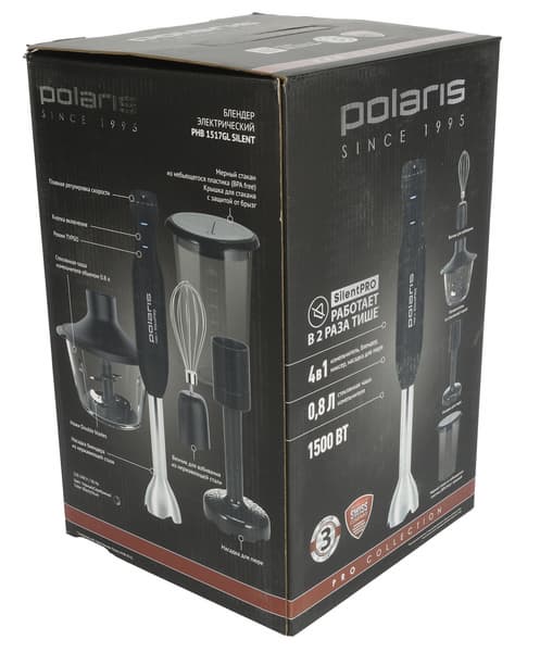 Polaris PHB 1517GL Silent прибыл к нам в фирменной коробке из матового черного картона, снабженной удобной ручкой для переноски.