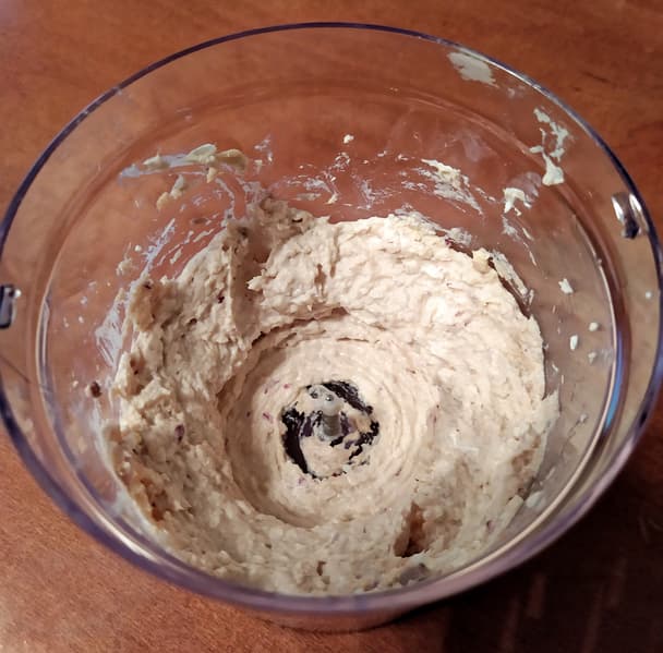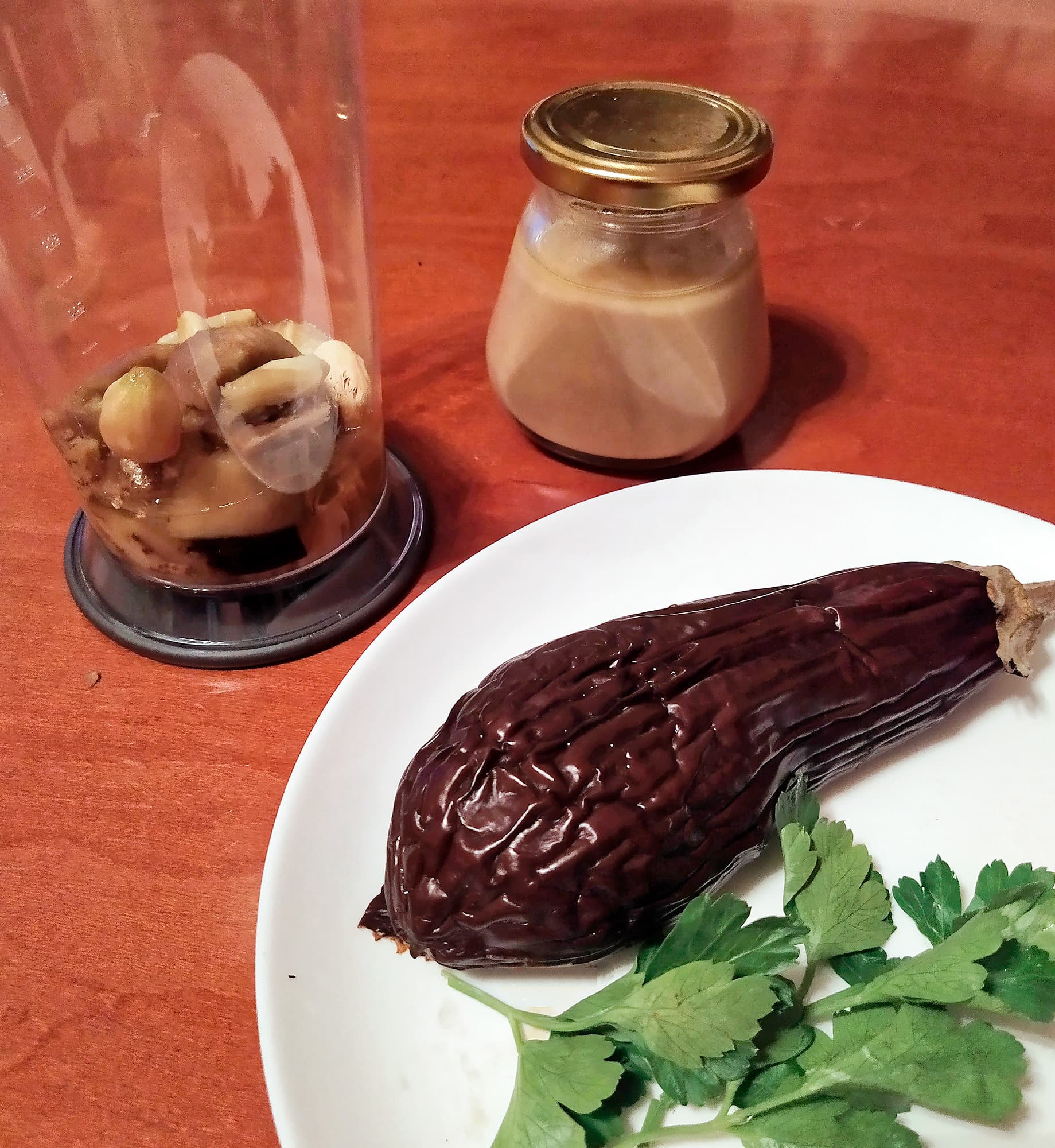Чеснок вынули через 20 минут, баклажаны запекались 1 час — мы дали им остыть и очистили от кожицы. В стакан для блендера положили порезанные баклажаны, три столовые ложки тахини, чеснок, оливковое масло и лимонный сок. За 15 секунд на 25-й скорости получили однородную кашицу.