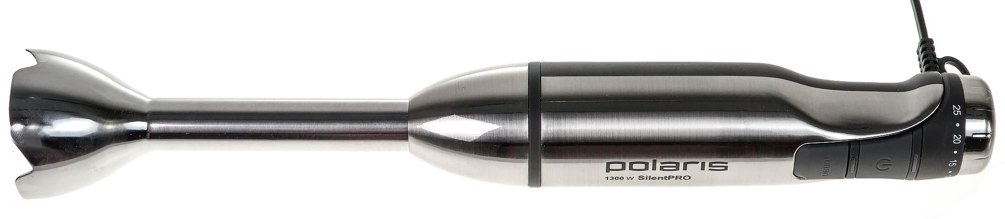 PHB 1382L Silent изящен, как ножка аристократки. Вытянутый моторный блок легкий и выполнен из двух видов пластика: металлизированного и матового серого. Правда, соединены эти части не очень удачно:между ними имеется зазор, в который может попадать еда или грязь. В зоне управления блок сужен, что облегчает работу с устройством. Спереди расположены две кнопки: основного режима и турбо, а увенчан он колесиком для плавного переключения скоростей. На электрическом шнуре, в месте его прикрепления к корпусу, расположена петля для подвешивания.