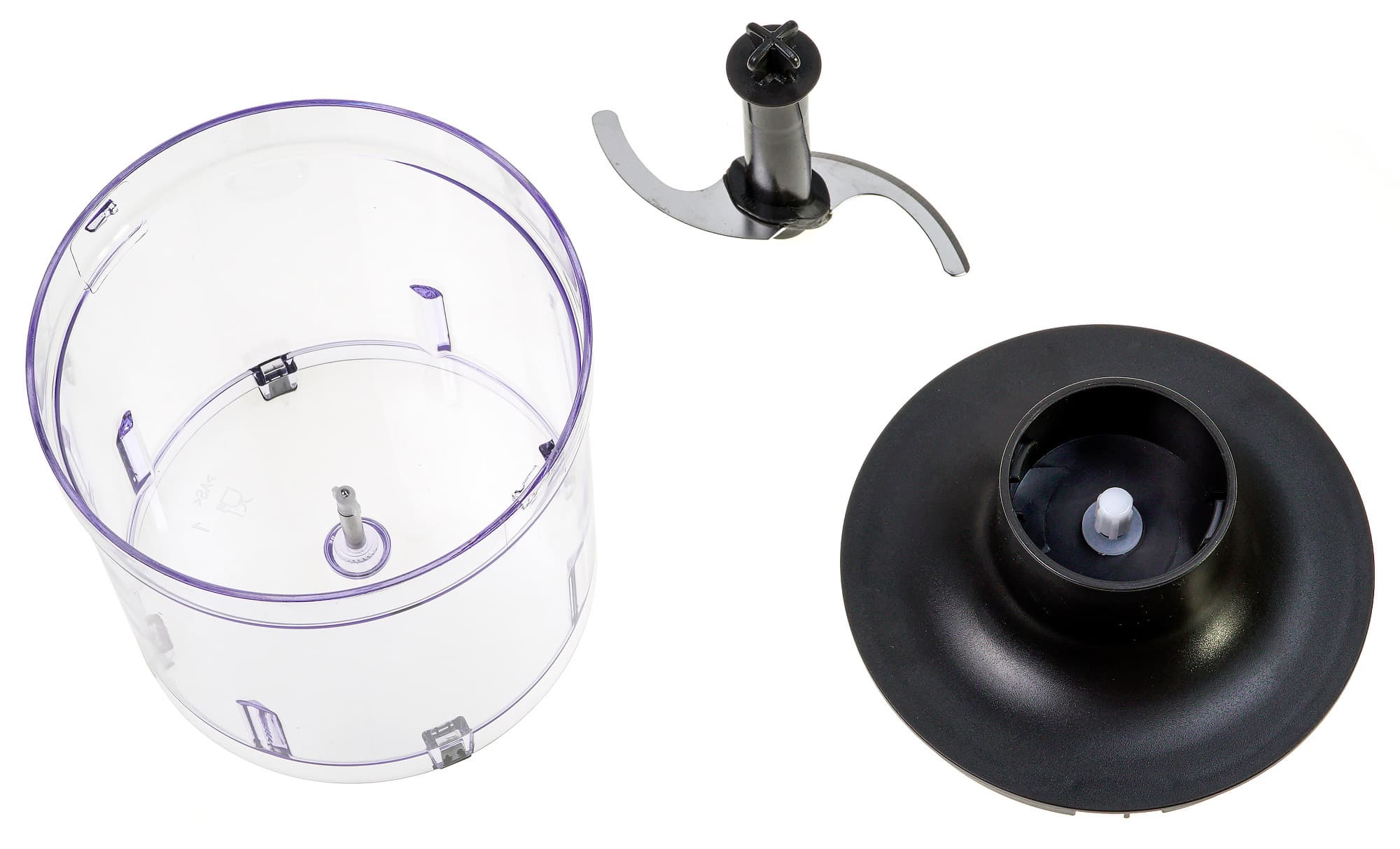 Чаша измельчителя тоже обычная — не богатырь. Никаких отметок объема на ней нет. Крышка-редуктор прилегает хорошо и прочно закрепляется на чаше поворотом по часовой стрелке.