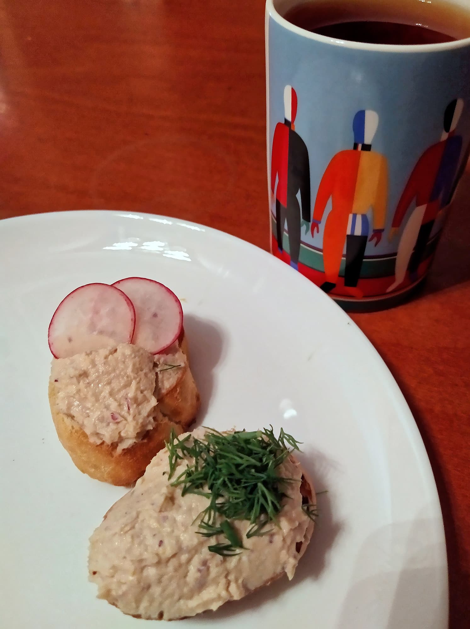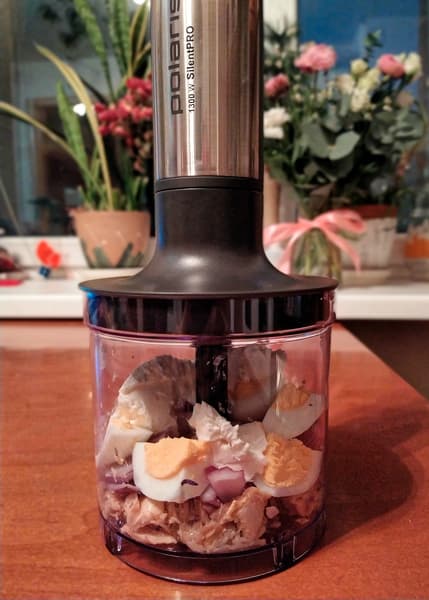 10 секунд на 20-й скорости, еще 10 — в режиме Turbo. В результате имеем нежный рыбный паштет, даже лук измельчился практически полностью.