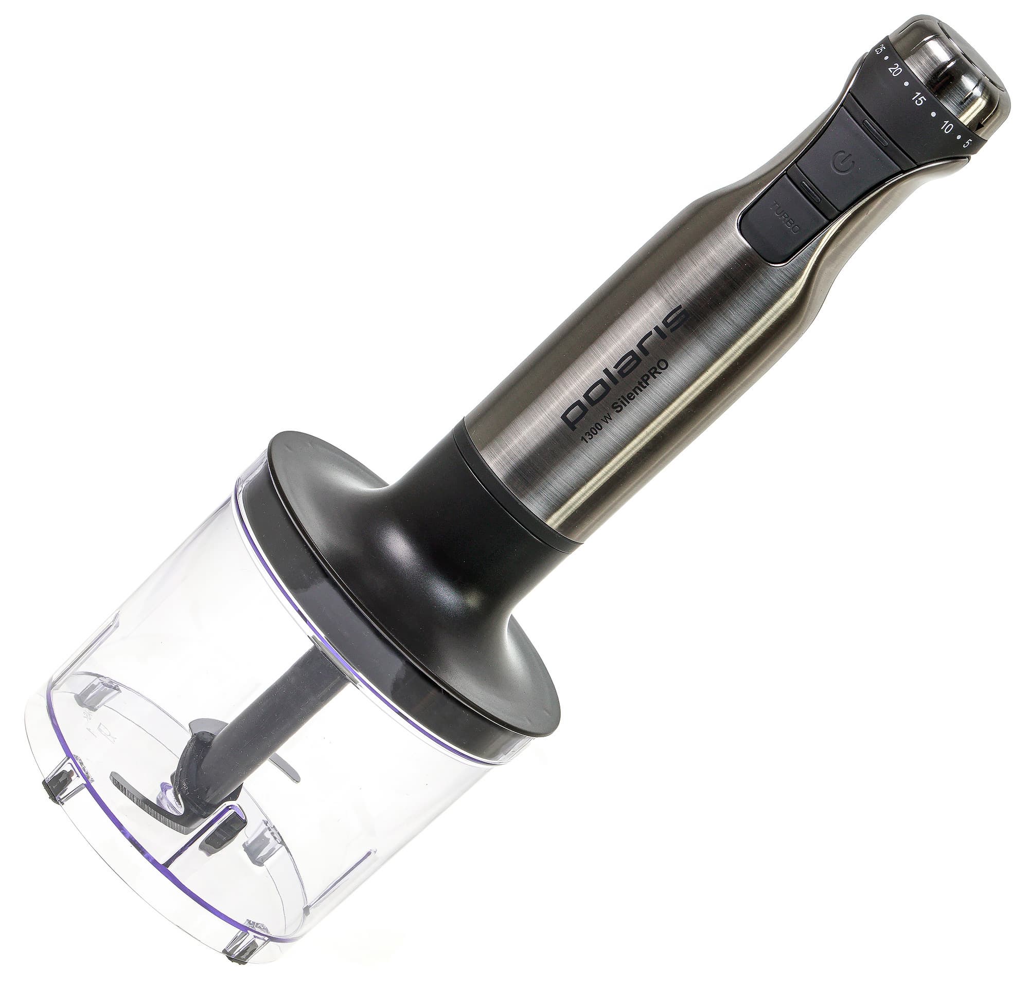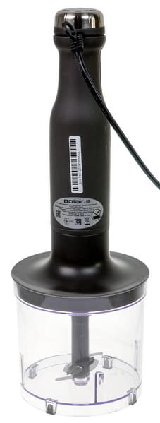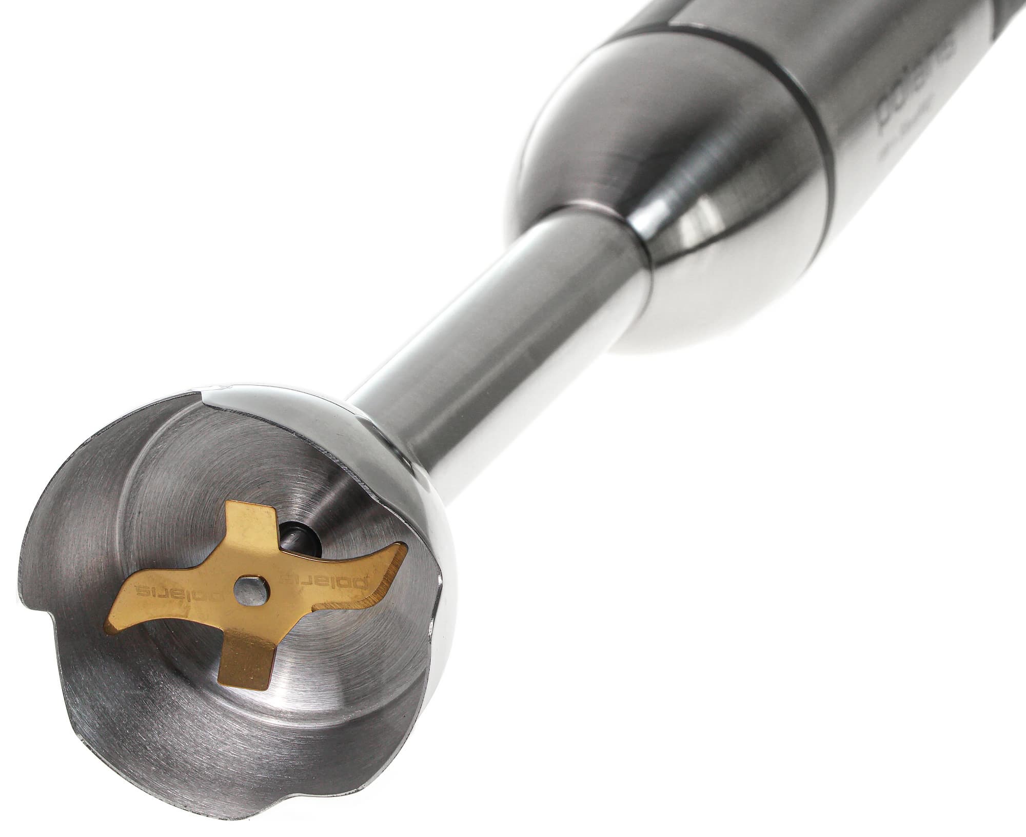 Насадка-блендер выглядит стандартно, а вот ножи по утверждению производителя имеют титановое покрытие, что делает их более долговечными. К тому же нож по форме четырехлепестковый — задел на то, что измельчаться все должно очень даже неплохо (в два раза лучше, чем двухлепестковым, обещает нам Polaris).