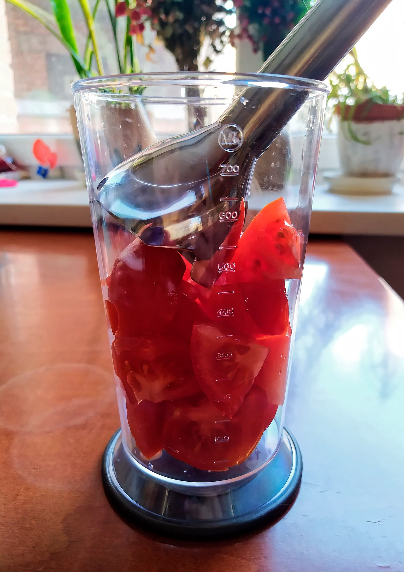 Перемещая блендер вверх-вниз, работали на максимальной скорости (25) 20 секунд. Этого оказалось очевидно недостаточно: в помидорном пюре плавали довольно крупные куски мякоти.
