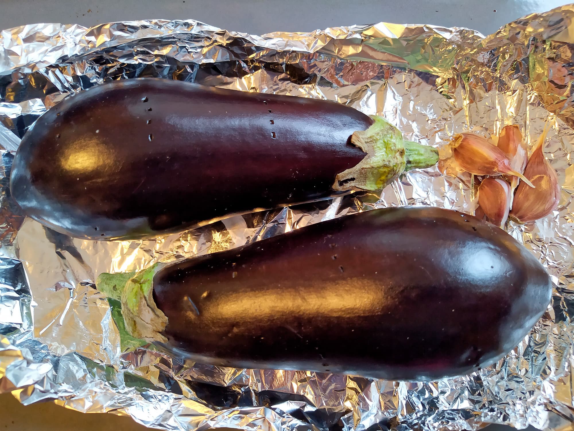 Баба-гануш — ближневосточная закуска из баклажанов и кунжутной пасты (тахини). Для ее приготовления мы отправили в духовку, нагретую до 170 градусов, два баклажана и несколько зубчиков чеснока.