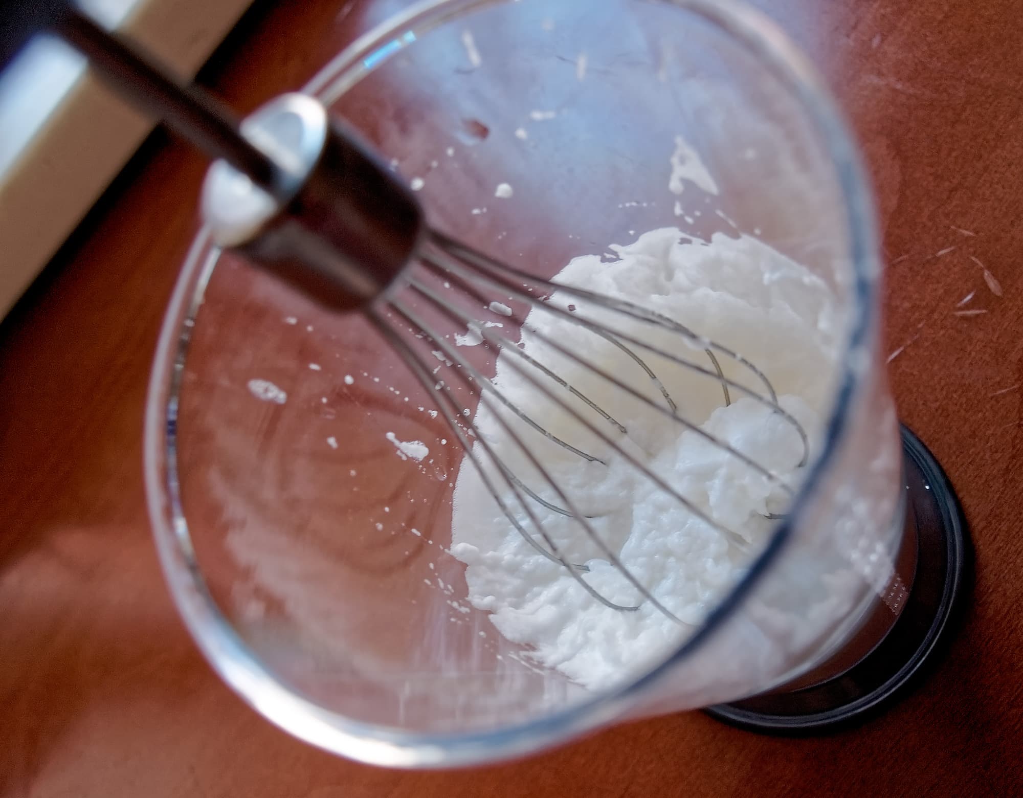 Белки с солью взбивали венчиком сначала на средней, потом на максимальной скорости — в общей сложности около минуты. Получили устойчивую пену, как и хотели. К этому моменту духовка нагрелась до 230 °C.