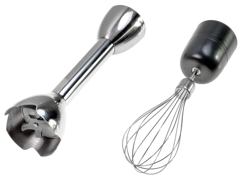 Венчик и нож-измельчитель, как и блендер, выполнены из нержавеющей стали. Нож выглядит стандартно, а вот венчик покрепче, чем в среднестатистическом недорогом подобном наборе (хоть по фото и не скажешь).