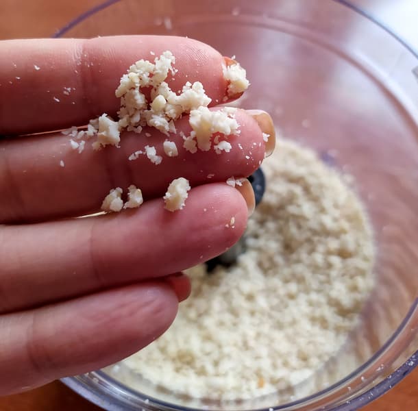Встряхнули чашу и еще 10 секунд мололи на турборежиме: целых ядер не осталось, но все же крошка однородной не была. Еще 6 секунд — картина та же.
