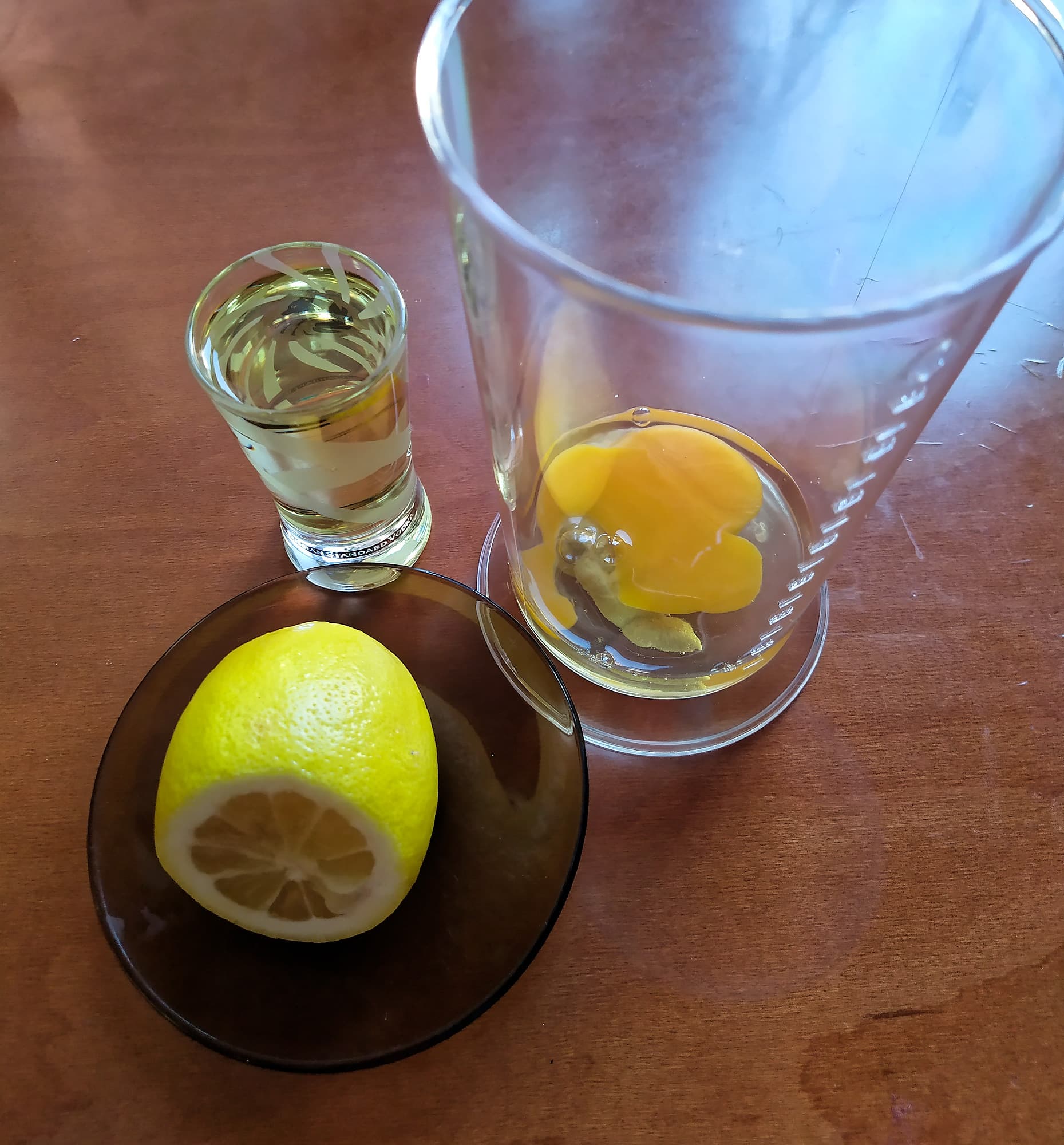 Для начала яйцо и горчицу эмульгировали с помощью блендера, затем добавили соль, сахар, перец и, продолжая взбивать, тонкой струйкой стали вливать масло, пока майонез не достиг нужной нам консистенции. После этого влили немного лимонного сока и пробили еще немного, чтобы он разошелся по соусу. На всё про всё ушла минута. Получили отличный майонез, никаких нареканий.