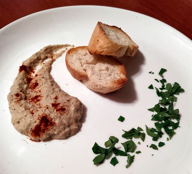 Готовый баба-гануш сдобрили солью, черным перцем и мелко порезанной петрушкой. Так как баклажаны мы запекали в духовке, а не на открытом огне, решили присыпать сверху копченой паприки, она придала блюду аромат дымка.