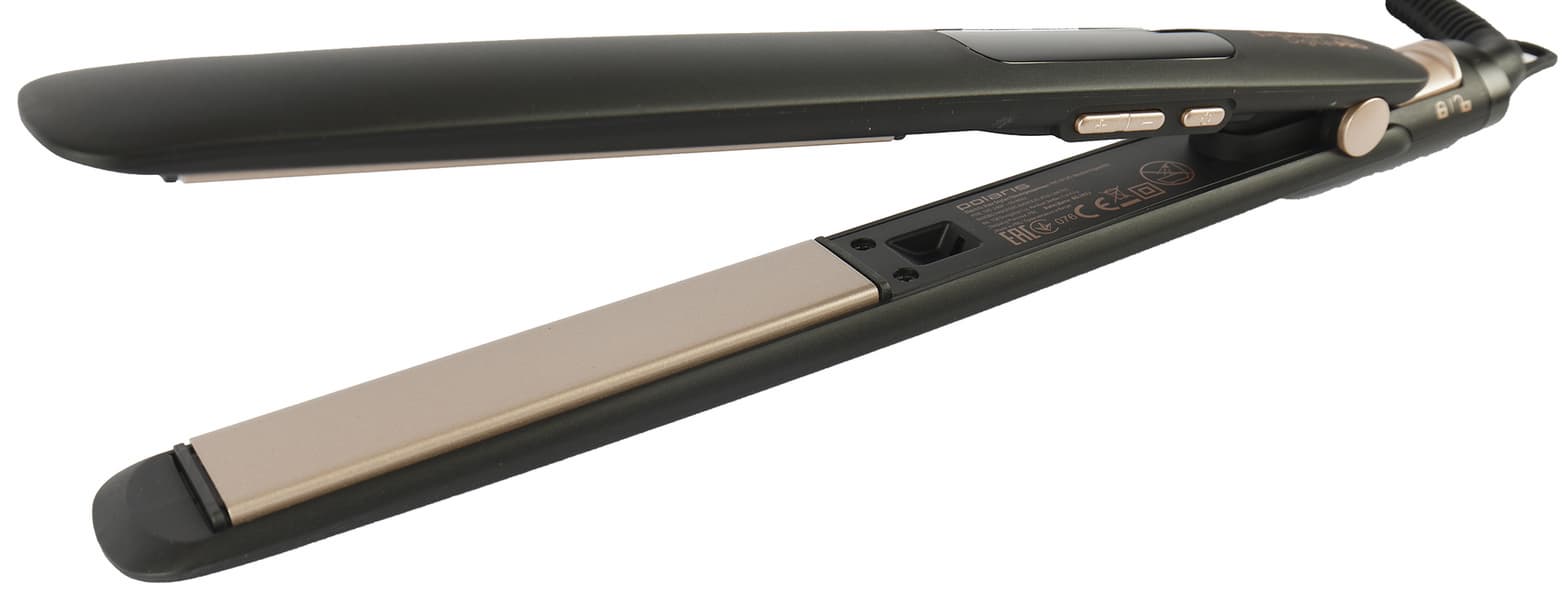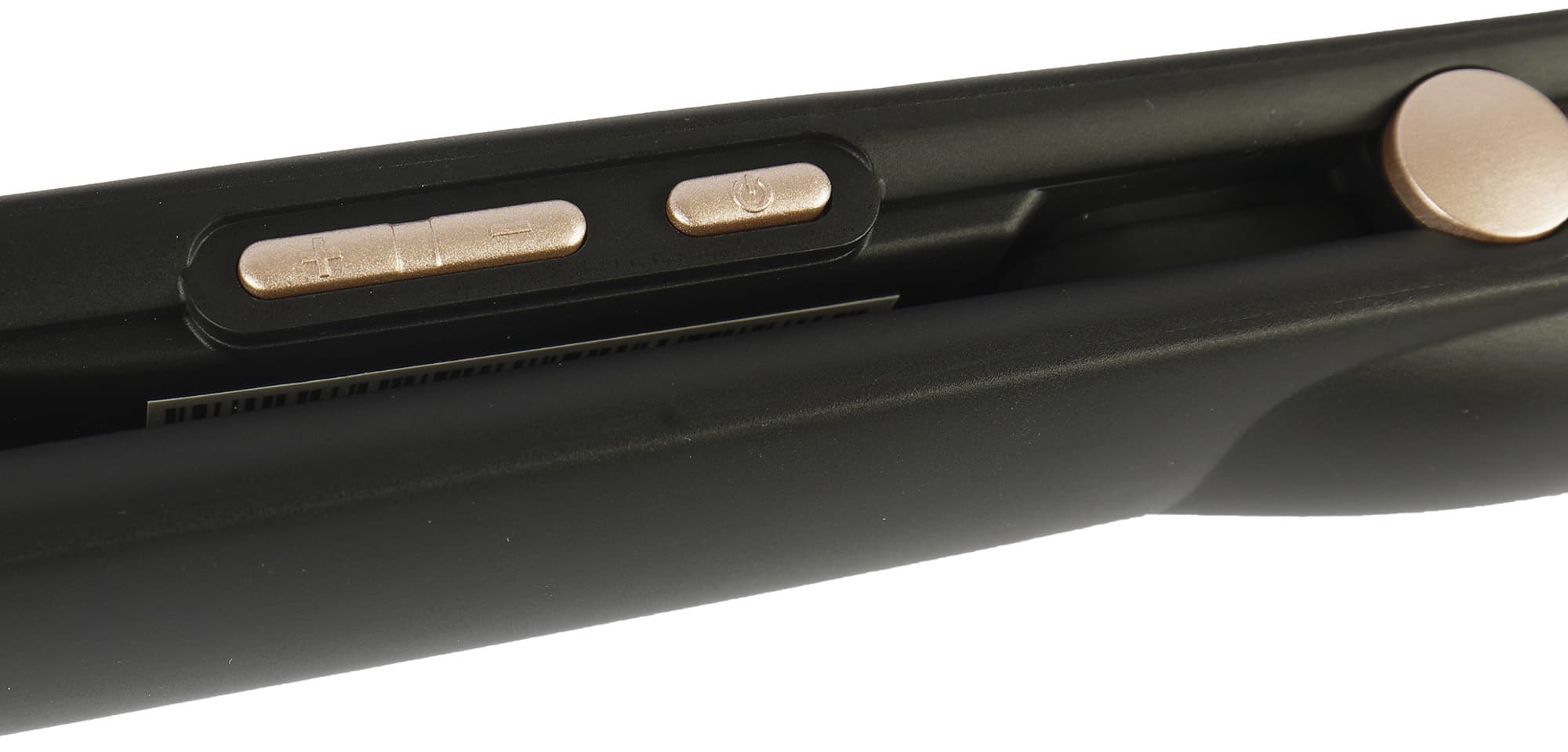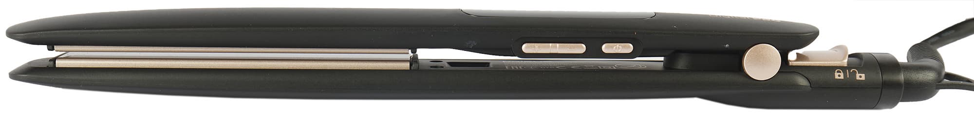 На верхней панели стайлера расположен большой LED-дисплей, отображающий выбранный температурный режим. Сбоку — кнопки управления. Между панелями находится фиксатор пластин в закрытом положении.
