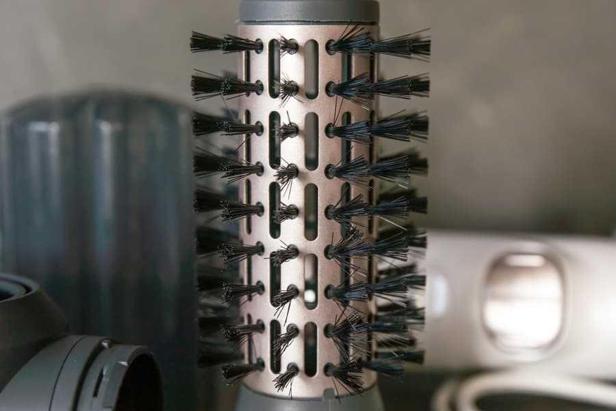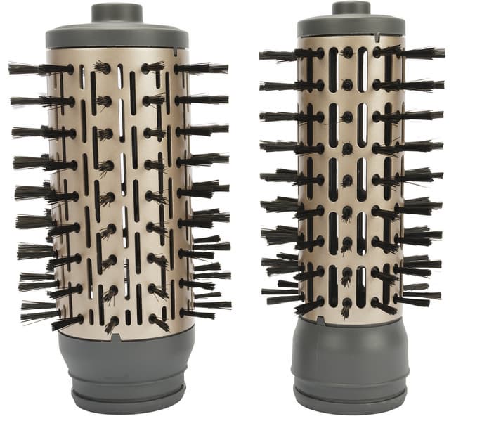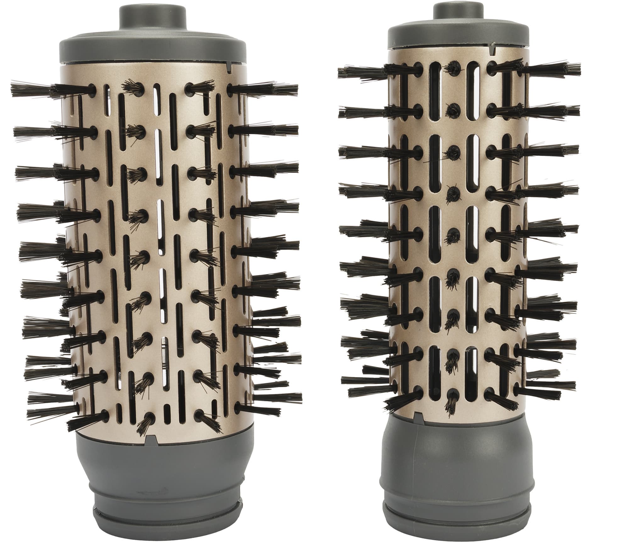 Две сменные вращающиеся насадки-щетки для вытягивания и подкручивания локонов различаются по диаметру (5 и 3,8 см) и густоте щетины в пучках.