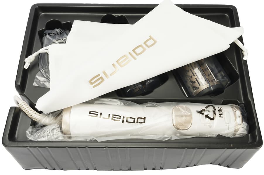 Внутри коробки — фен и аксессуары, каждый в своем полиэтиленовом пакете, уложены в пластиковый держатель, что позволяет всем элементам оставаться в неподвижности при транспортировке.