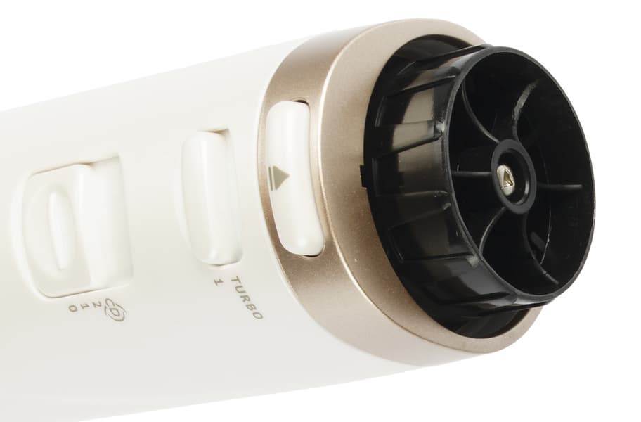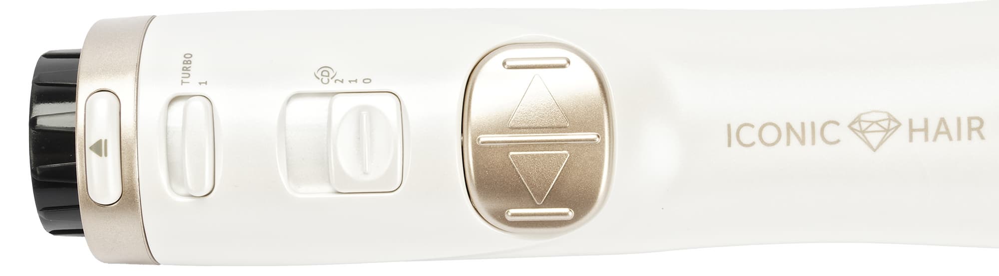 Фен-расческа управляется при помощи трех переключателей. Самый верхний двухпозиционный отвечает за выбор скоростей вращения насадок: первой и Turbo.