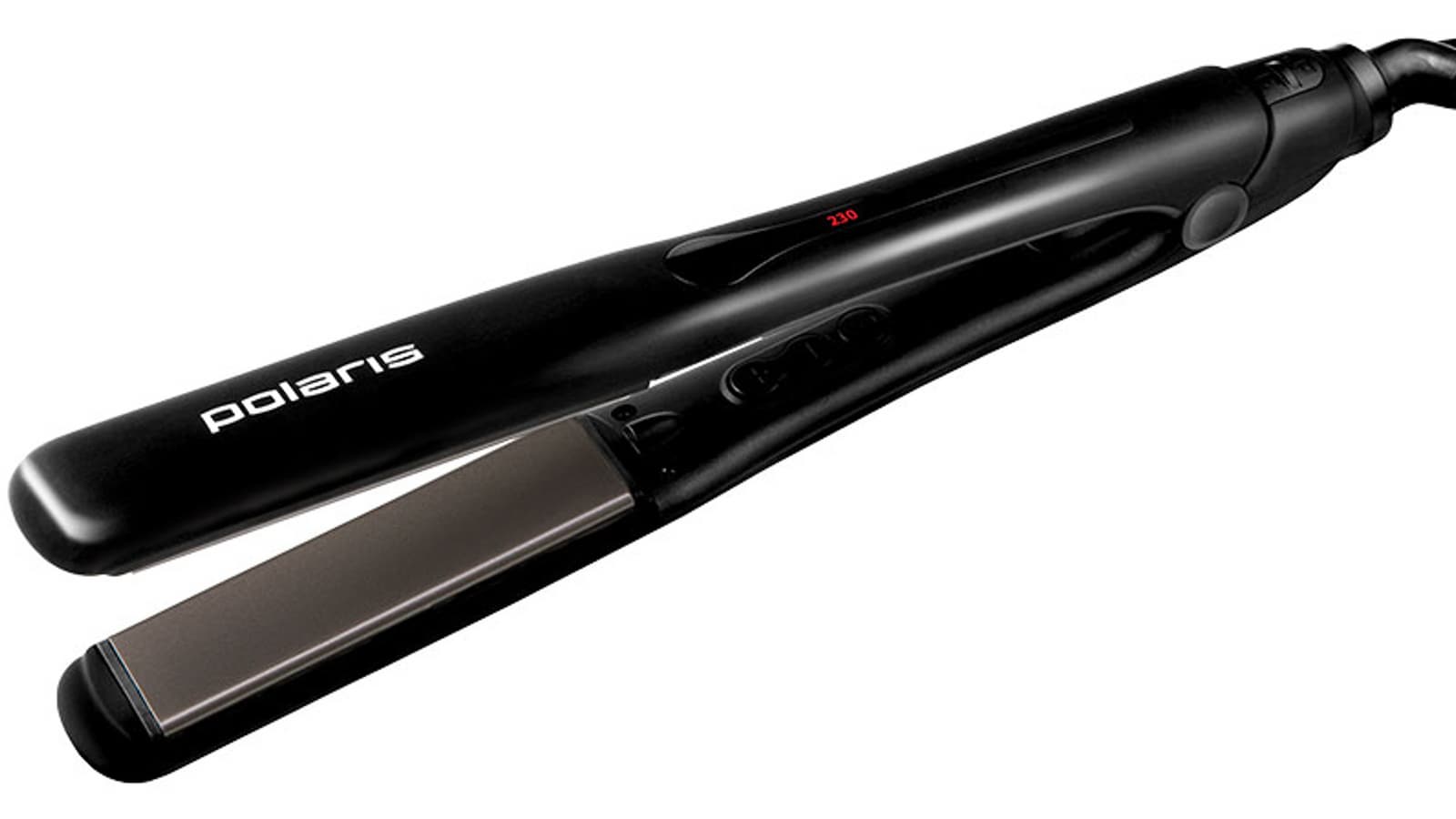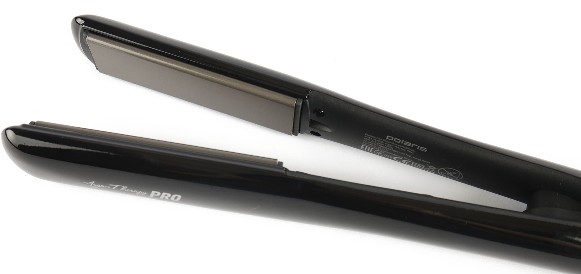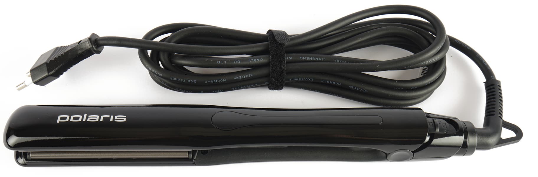 Корпус Polaris PHSS 2595TAi, выполненный из глянцевого пластика черного цвета, выглядит сдержанно и стильно. Прибор удобно держать в руке, он немного весит и имеет стандартный, небольшой размер — 29 см в длину. Размер рабочих панелей (2,7×9,5 см) выглядит достаточным для того, чтобы эффективно уложить волосы любой густоты.