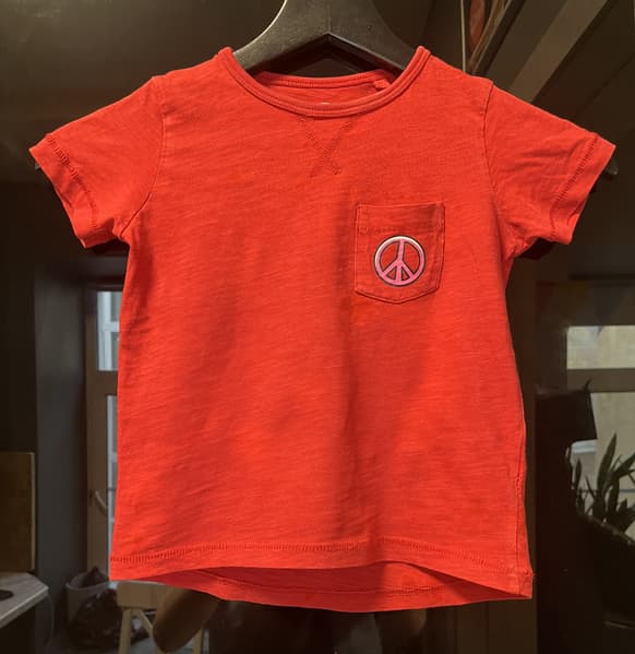 Мы взяли детскую однотонную хлопковую футболку и подобрали к ней две термонаклейки.