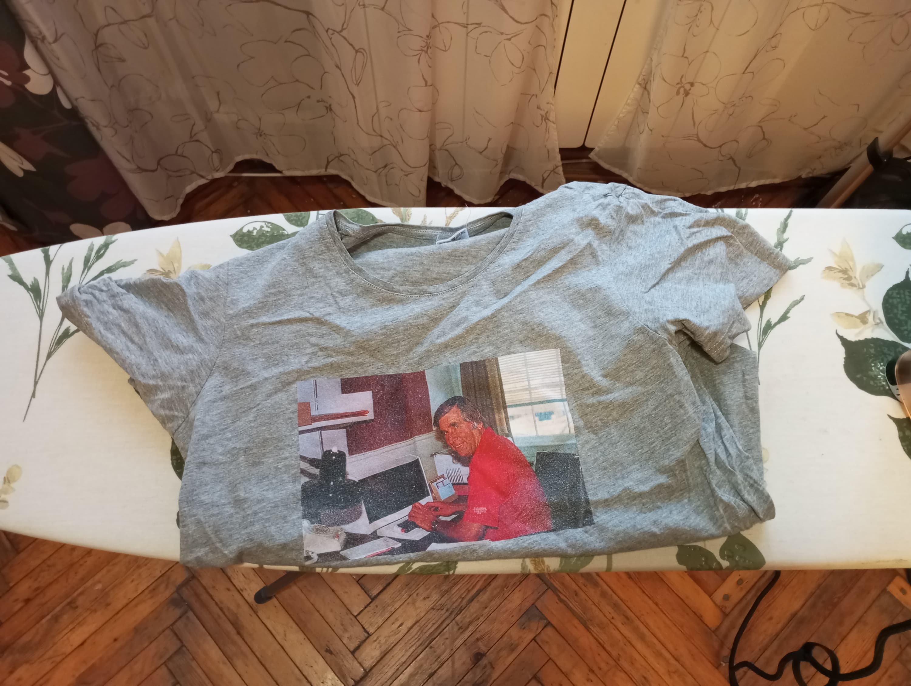 Нанесение на современных футболках не всегда отвечает общему качеству, горячий утюг размазывает его по ткани. Проверили, убедились, что риск остается, закончили обработку с изнаночной стороны. Использовали максимальный режим и паровой удар.