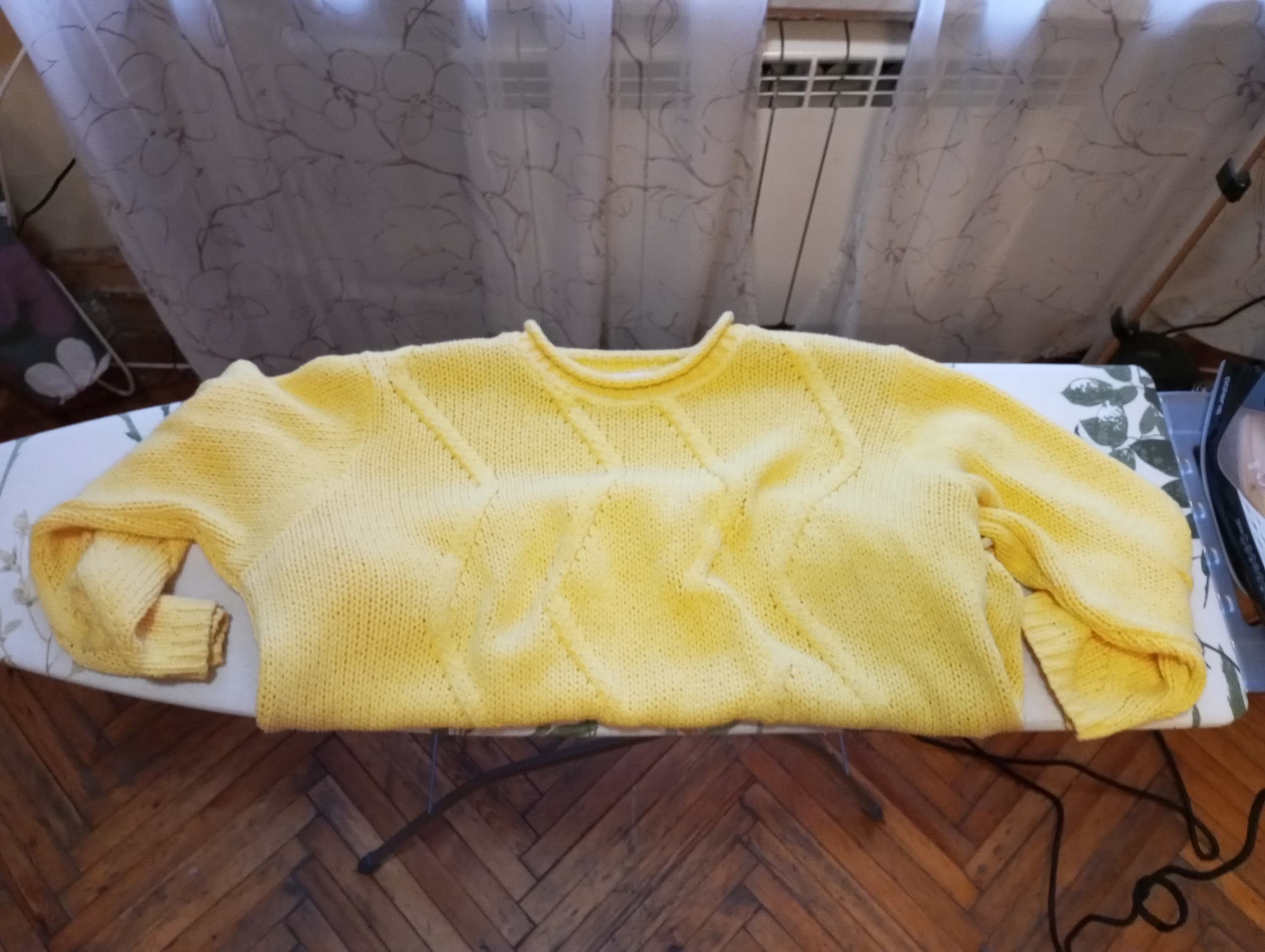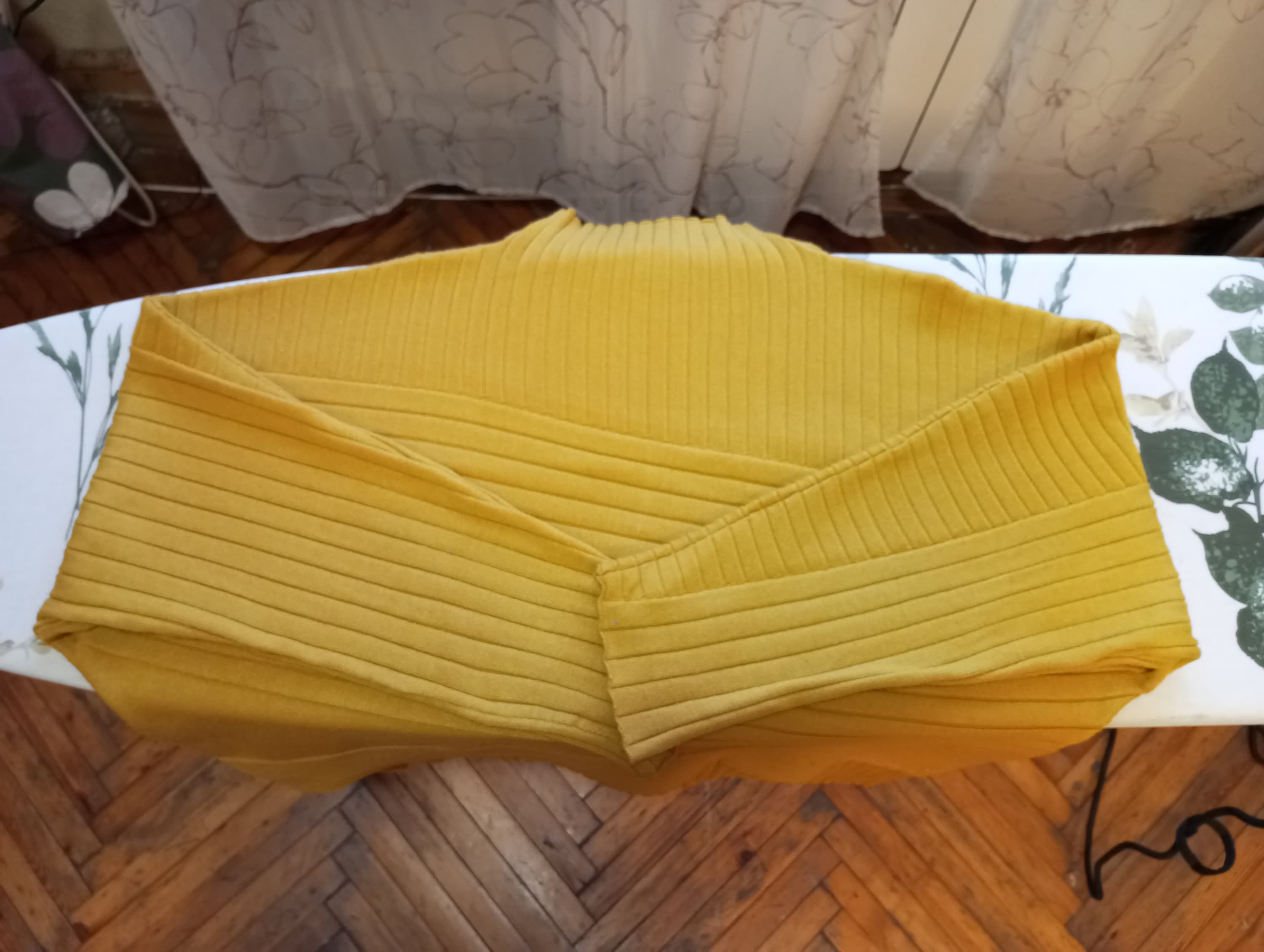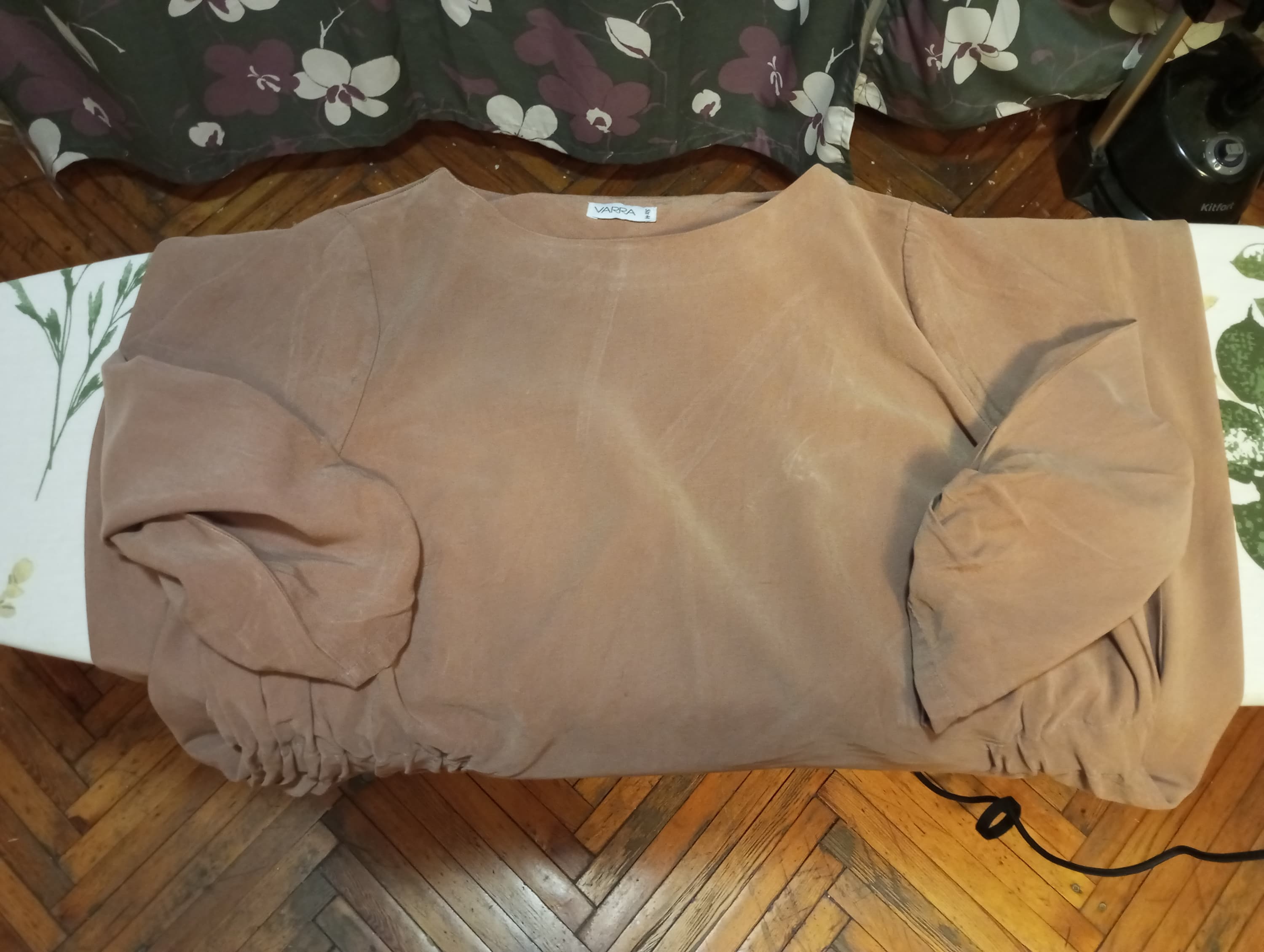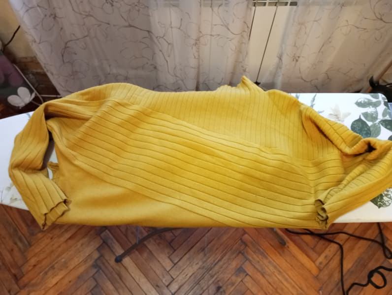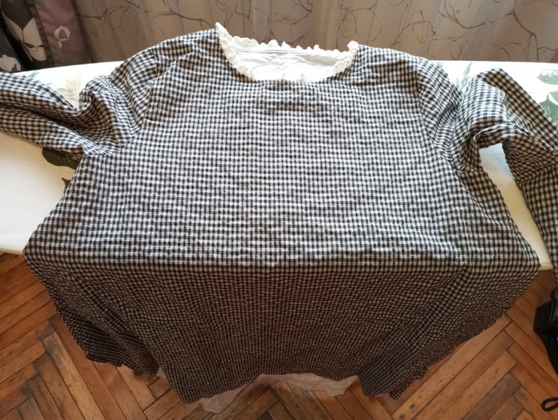 Упрямая, легко мнущаяся ткань с заломами после стирки. Сложность кроя добавляет специфики в обработке таких вещей, плюс требуется максимальный режим и особая деликатность. Тестировали разбрызгивание и паровой удар. На итоговом снимке видна небольшая заглаженность ткани, результат предсказуемый, но уступающий отпариванию.