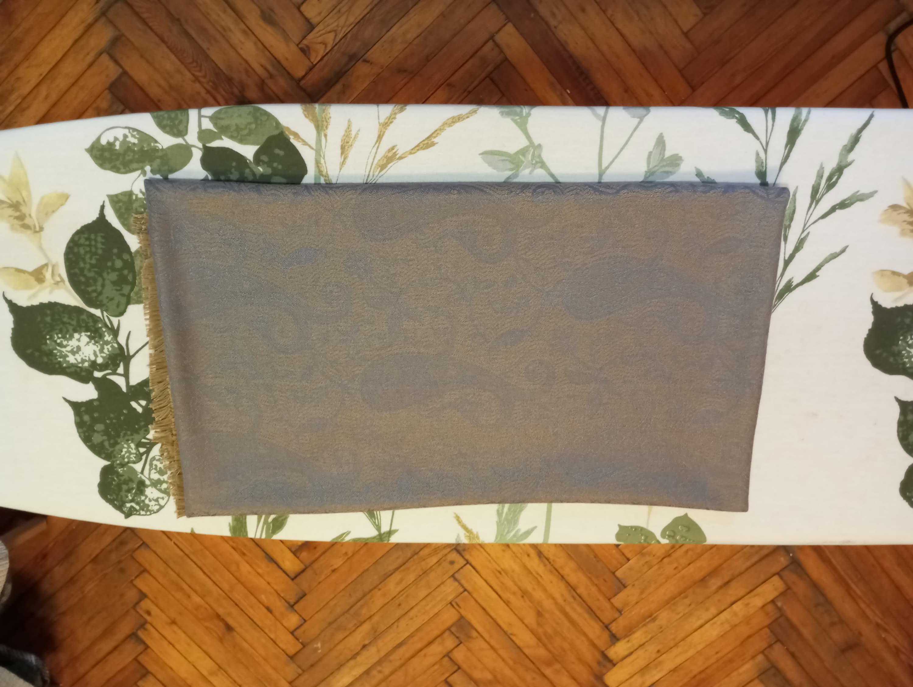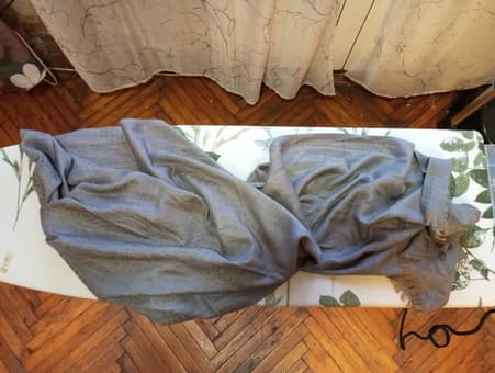 Капризная, требующая особенной деликатной обработки ткань. Кашемир на самом деле опасно обрабатывать утюгом вплотную — только паром и на расстоянии 1-2 см от ткани. Потому и выбрали ткань для теста, проверили насколько прибор будет деликатен. Слабый режим, отпаривание, быстрый результат.