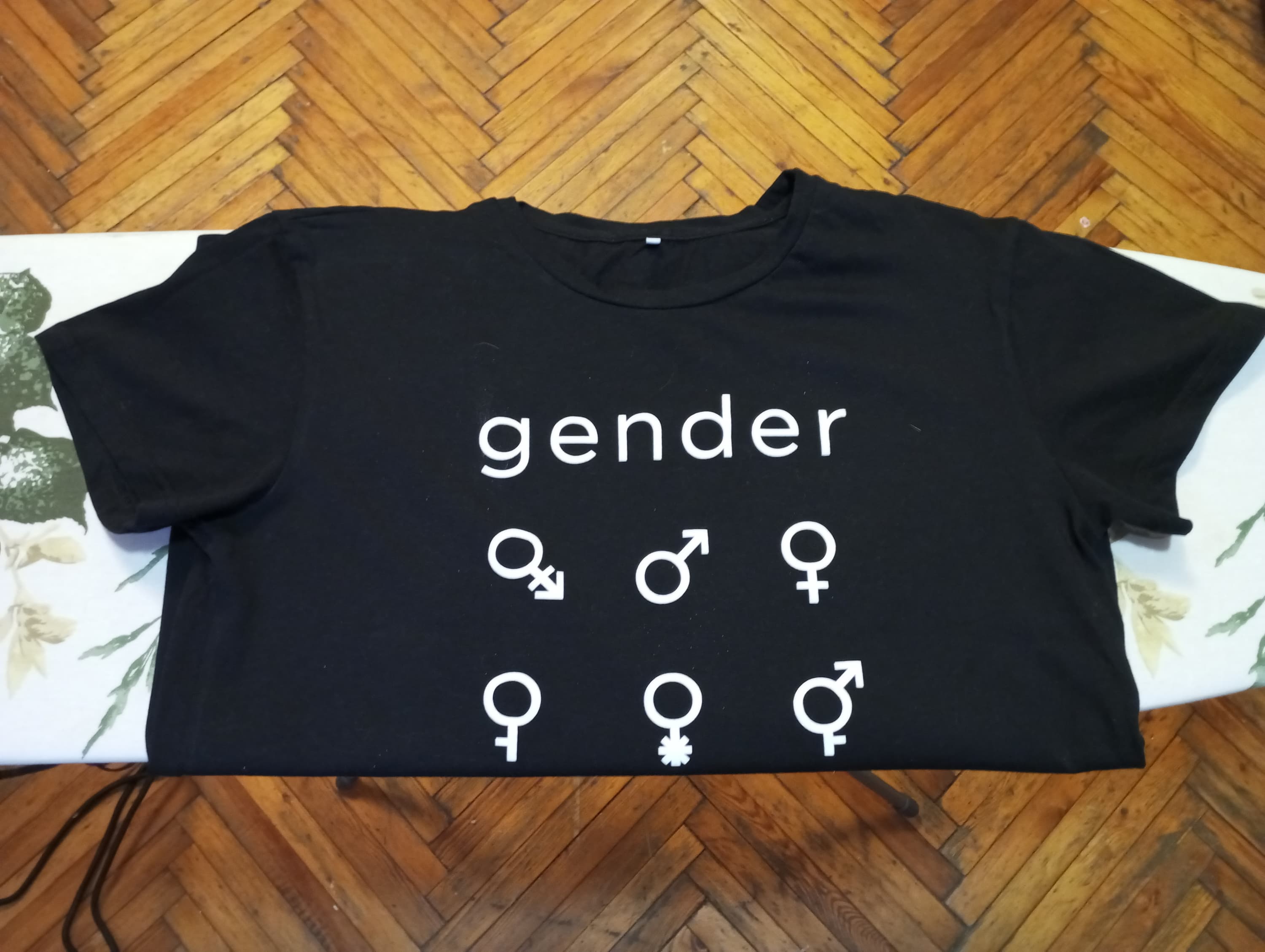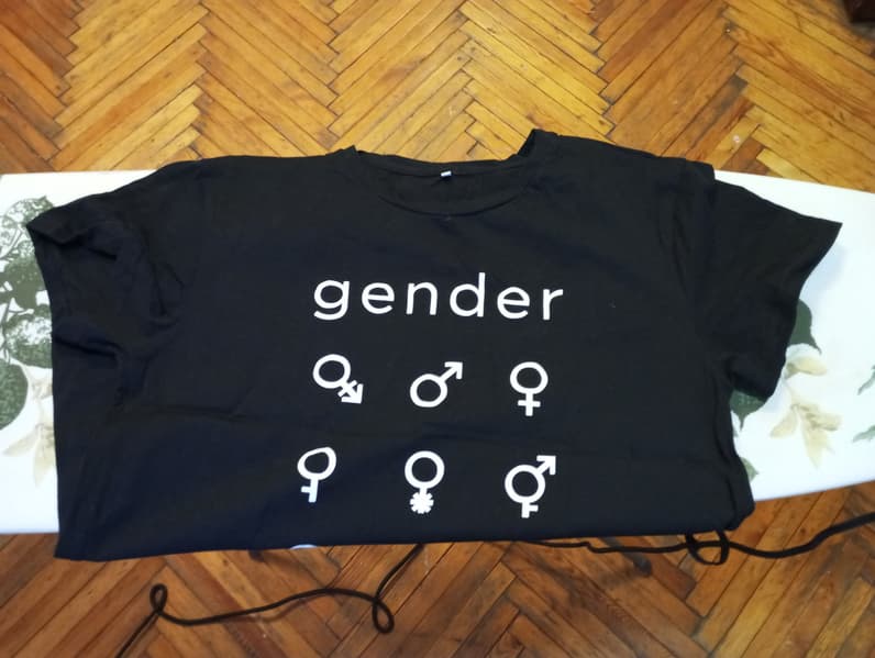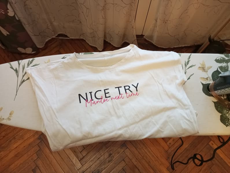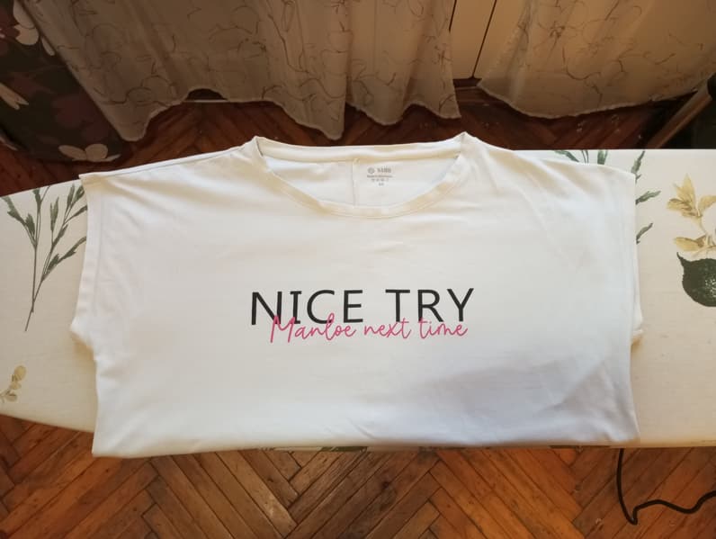 Снова коварное нанесение, особенно при первой обработке не всегда понятно навредит горячий утюг надписи или нет. Для начала загладили угол первой буквы, поняли, что рассыпается. Дальше вывернули футболку, прогладили на максимальном режиме, получилось замечательно.