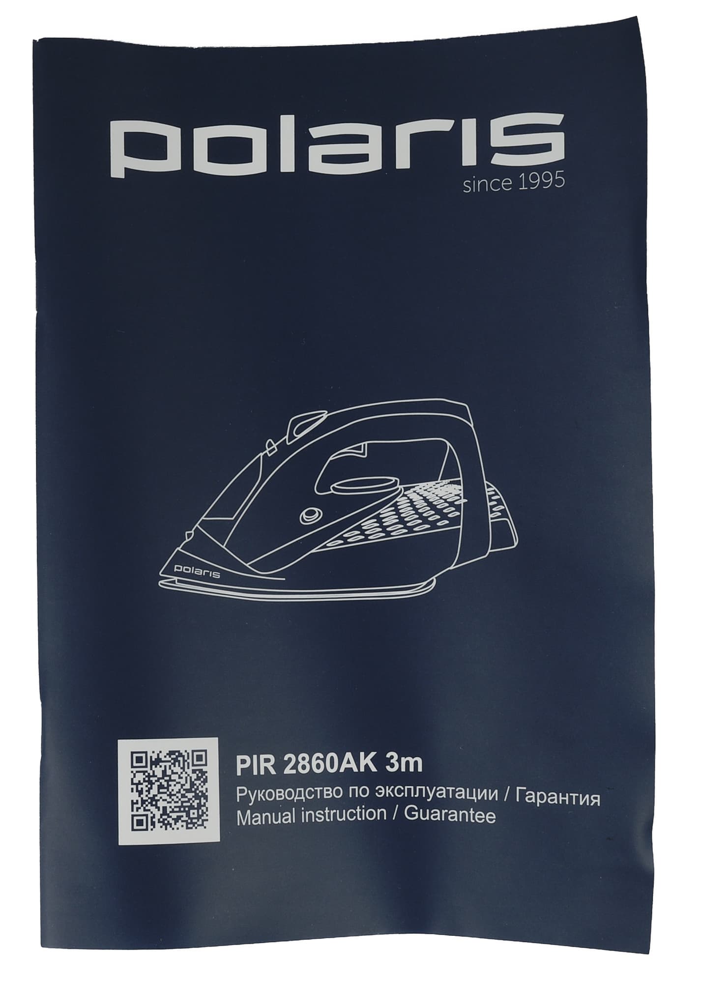 Polaris PIR 2860AK 3m упакован в фирменную глянцевую коробку. На черной крышке имя бренда, наименование модели и QR-код, ведущий на сайт.