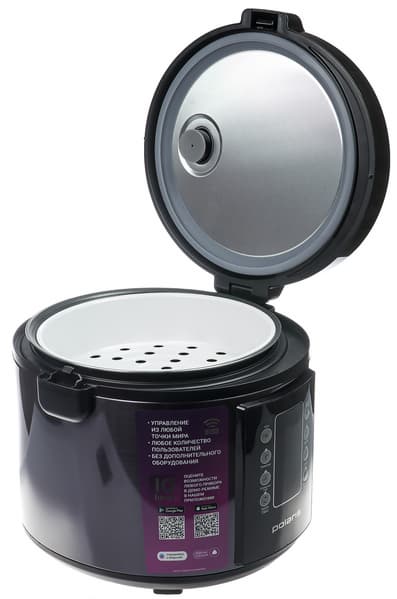 Мультиварка Polaris PMC 0521 IQ Home — довольно большой цилиндрический прибор черного цвета. Корпус и ручка сверху из пластика, покрытого рекламными фиолетовыми наклейками. Дизайн можно назвать ненавязчивым.