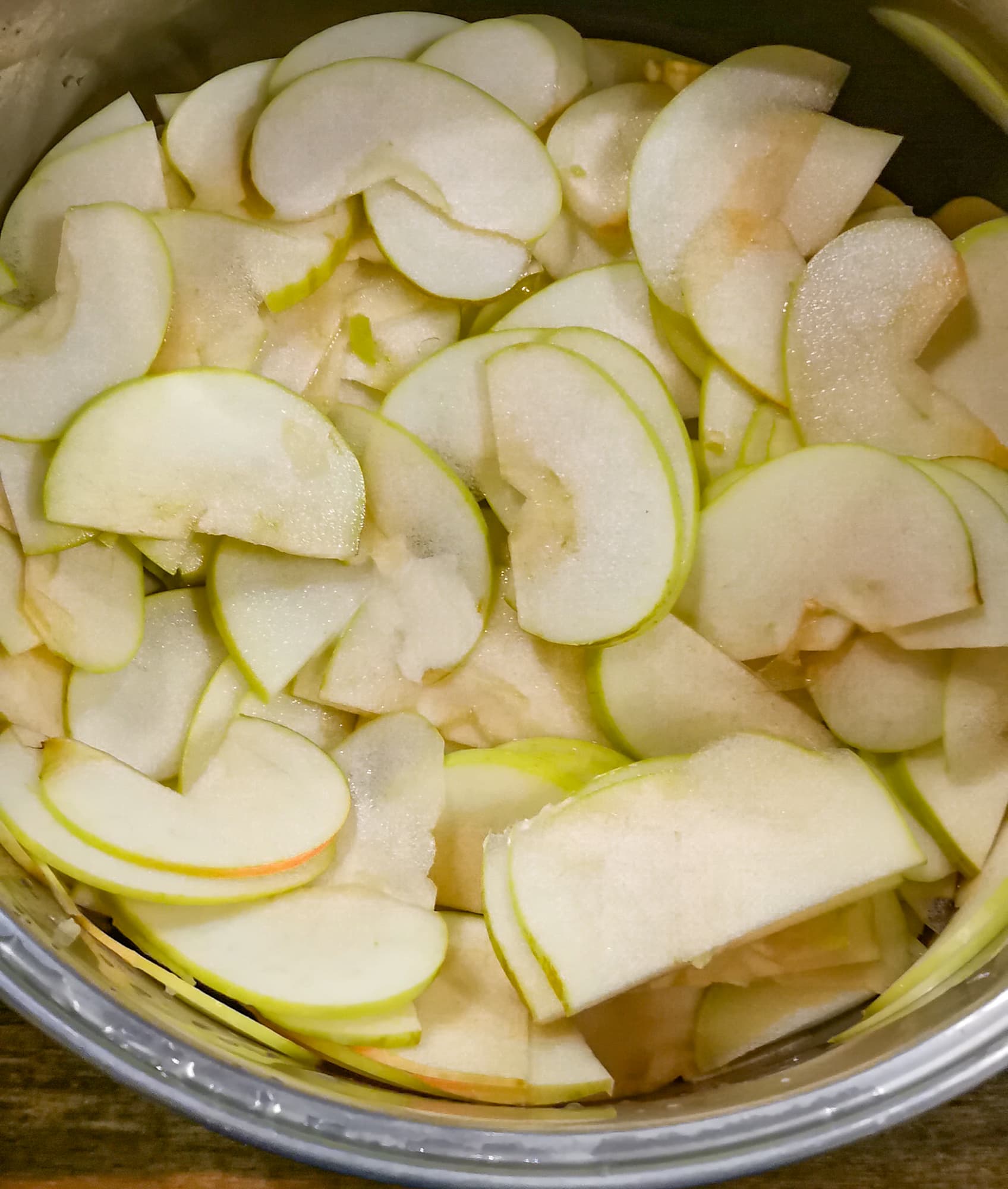 Смысл «невидимого» пирога в том, что в нем практически отсутствует тесто, яблоки склеиваются между собой за счет совсем небольшой его прослойки и собственного пектина. А охлажденный пирог при этом отлично держит форму.