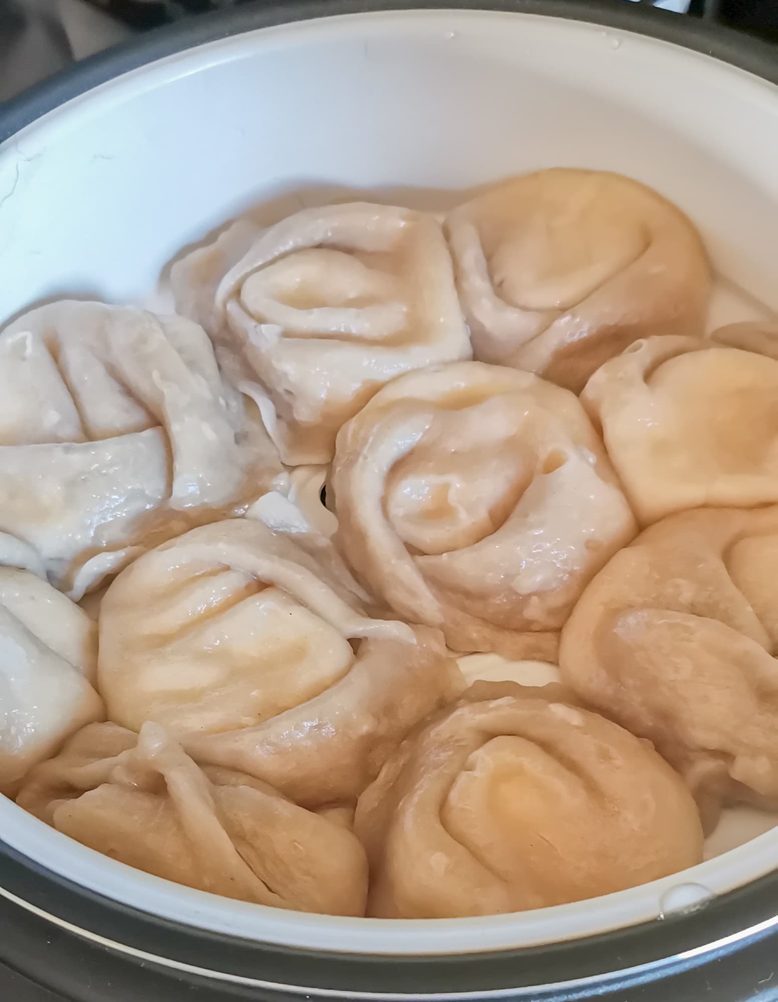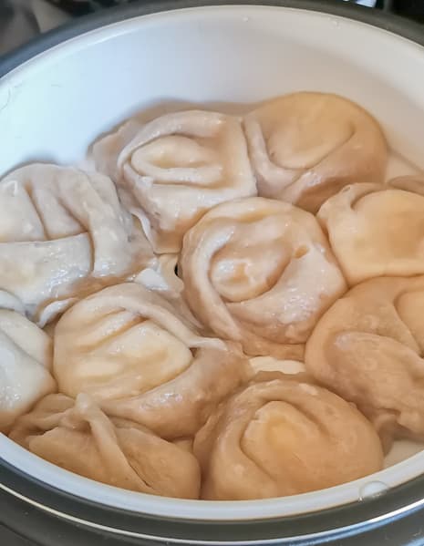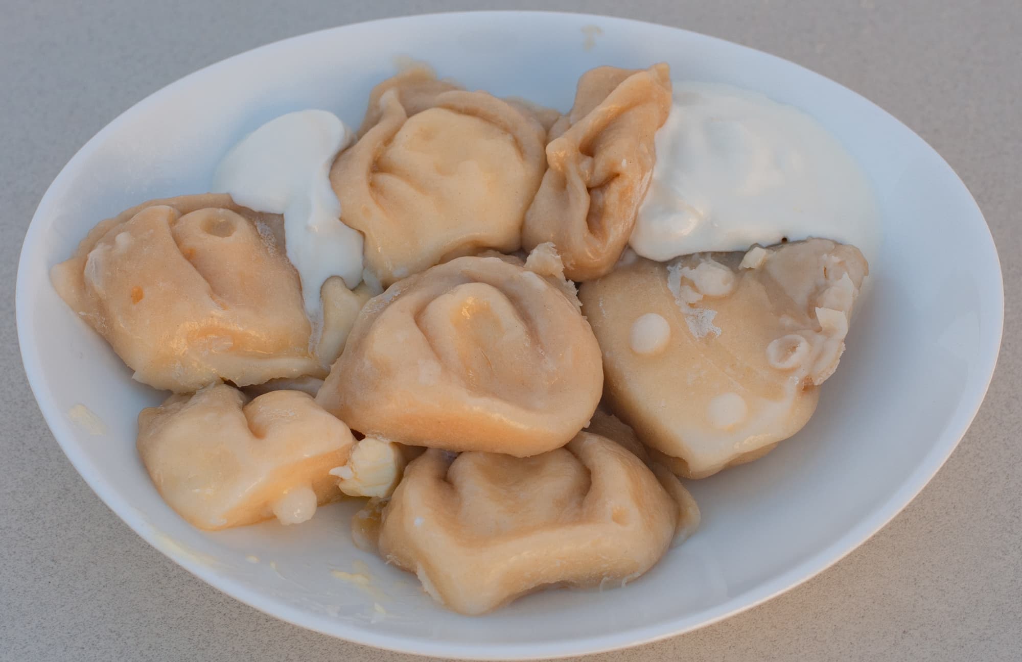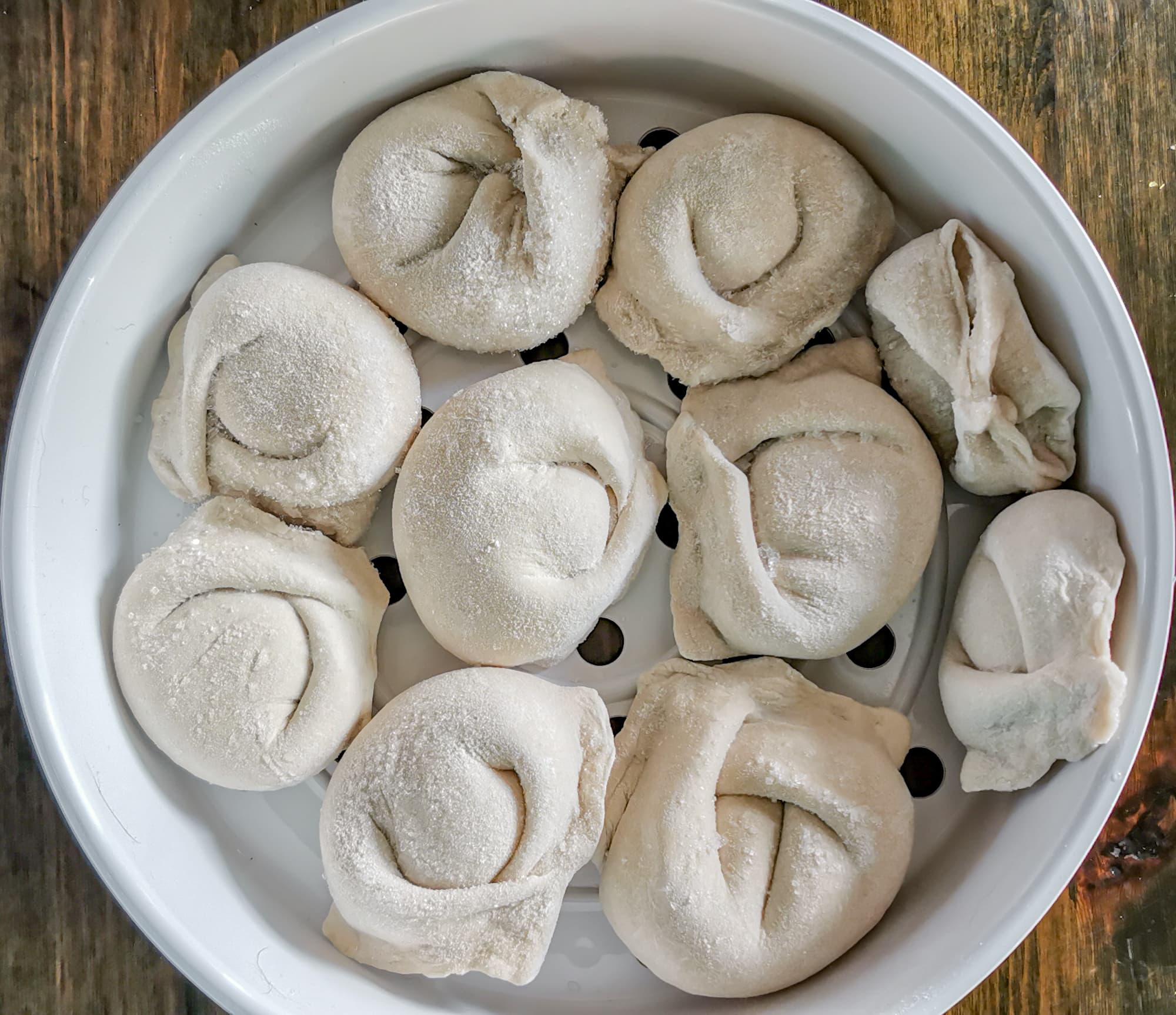 Вареники получились неплохо, тесто осталось целым. Но в процессе варки тесто перекрыло все отверстия контейнера, поэтому варка происходила дольше и сами вареники получились в «пупырышках». При варке на пару́ овощей таких проблем не возникнет.