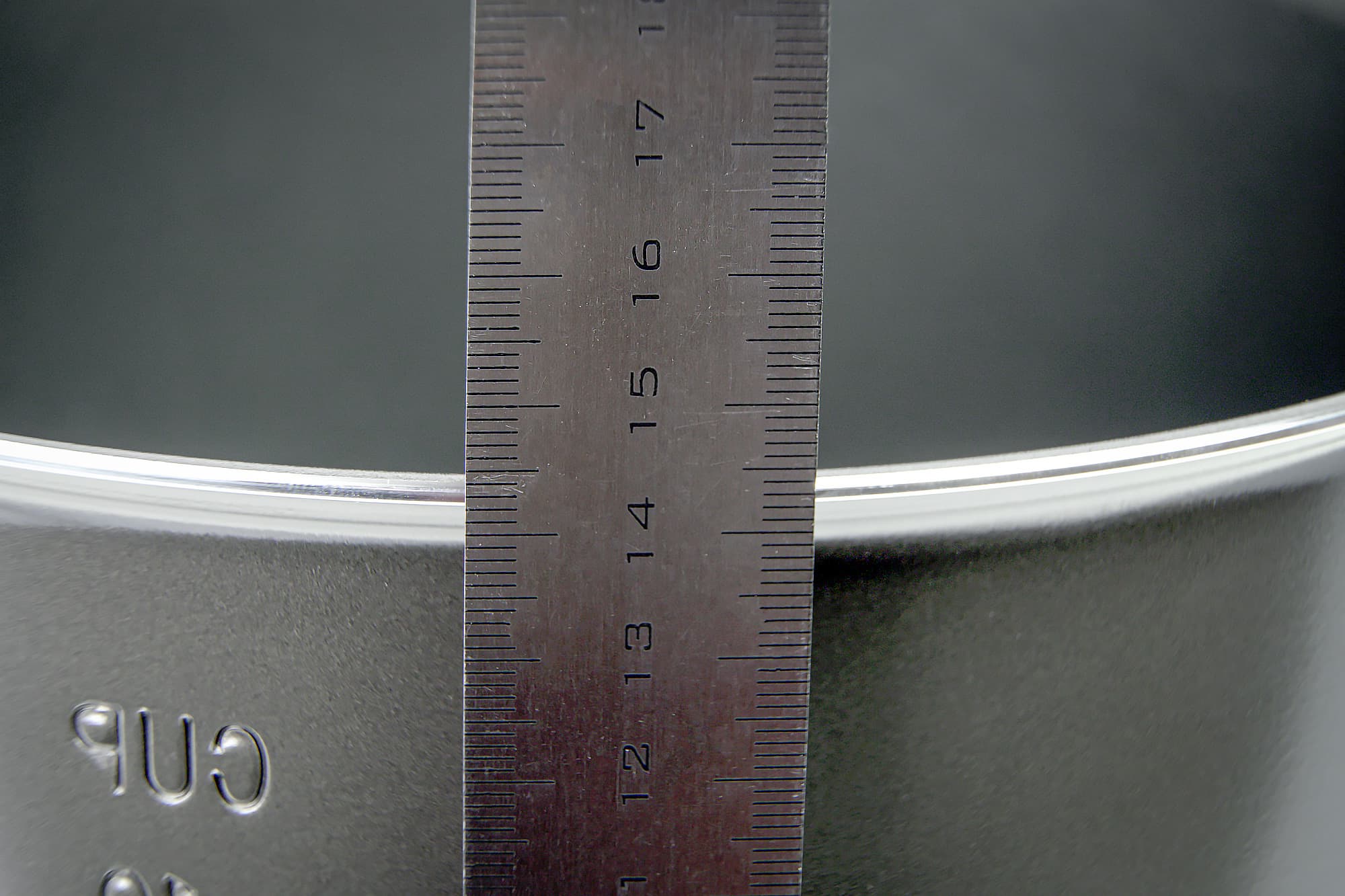 Чаша мультиварки полной емкостью в 5 литров достаточно толстостенная, добротная, с хорошим антипригарным покрытием. На стенке — мерная шкала в чашках и литрах. Максимальное значение — 10 чашек или 3,5 литра, это полезный объем.