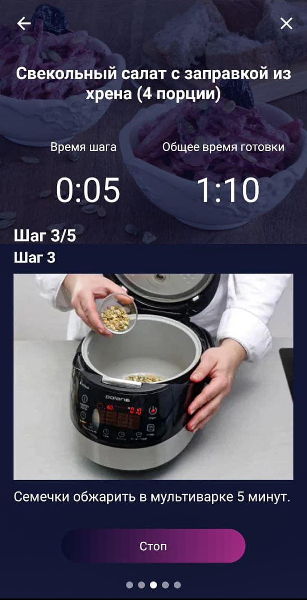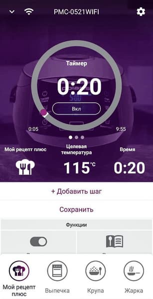 На экране будет появляться описание этапа приготовления блюда и кнопка старт. При нажатии «старт» мультиварка включается на нужное время при заданной температуре. По окончании этапа на смартфон приходит оповещение и задается следующий шаг.