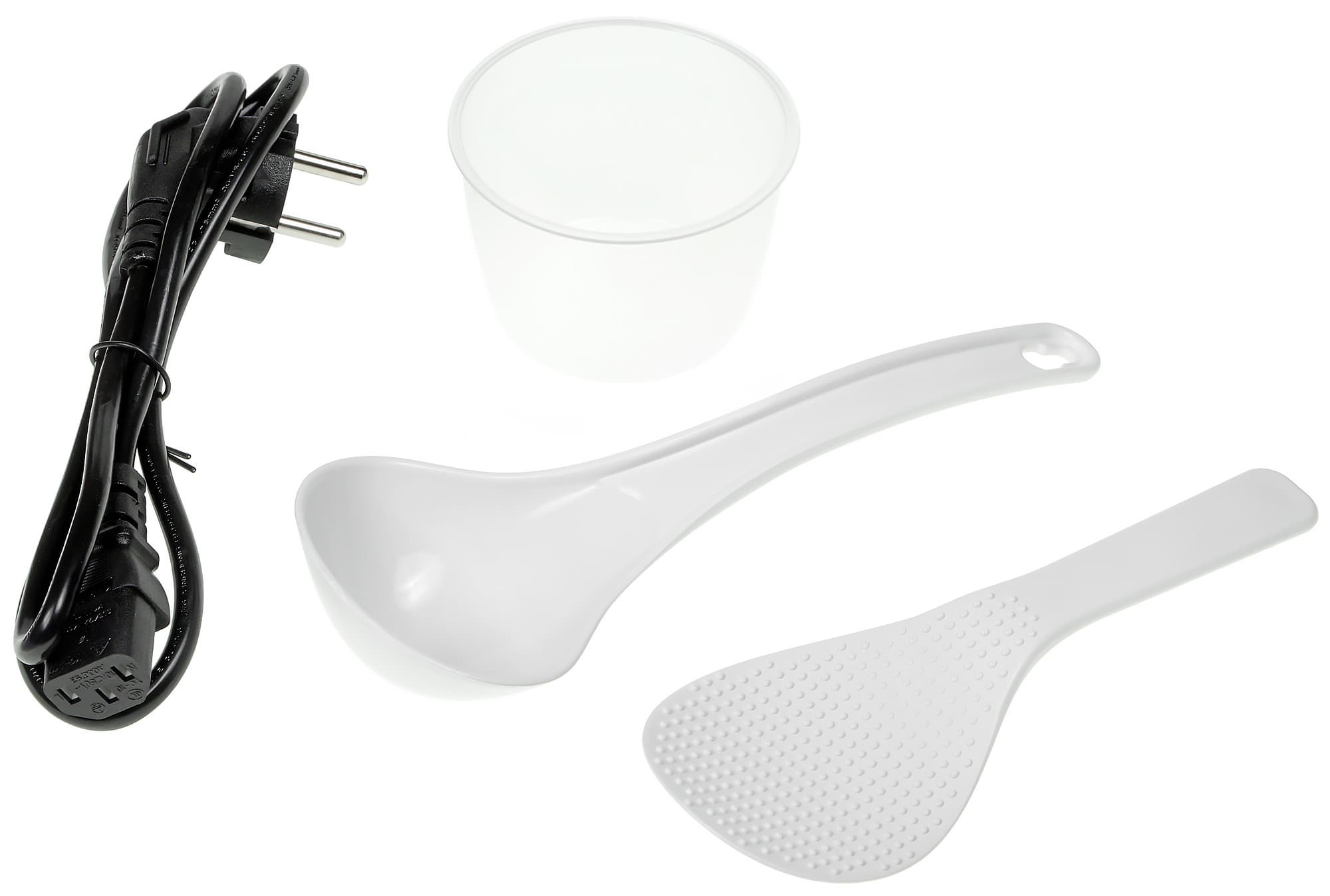Шнур питания длиной 1 метр — полностью съемный. Он соединяется с прибором сзади сбоку. В комплекте также идут две пластиковые ложки и мерная чашка.