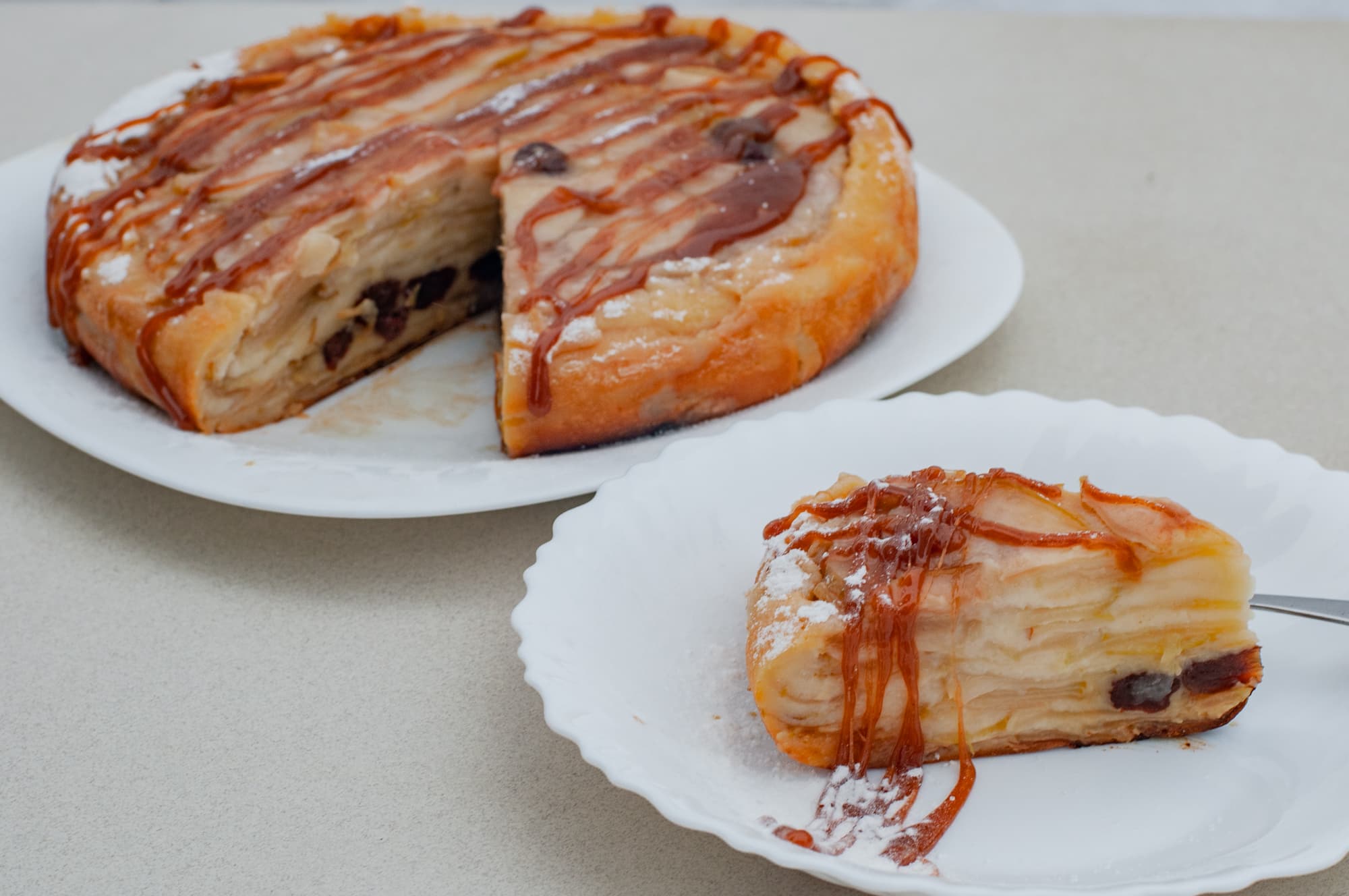 Достали пирог, полили сверху карамелью, посыпали сахарной пудрой.