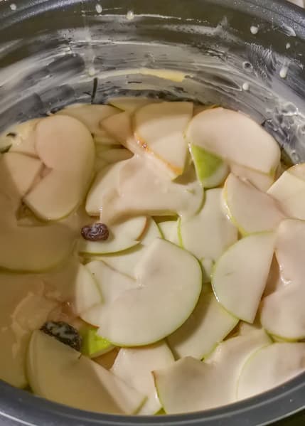 Для пирога мы нарезали антоновку максимально тонко, опустили ее в воду с лимонным соком, крупный изюм замочили.
