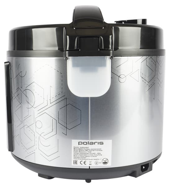 Сзади снаружи контейнер для сбора конденсата с крышки, его надо очищать после каждого использования мультиварки. Вынимается и вставляется легко. Под съемным контейнером — наклейка с техническими характеристиками.