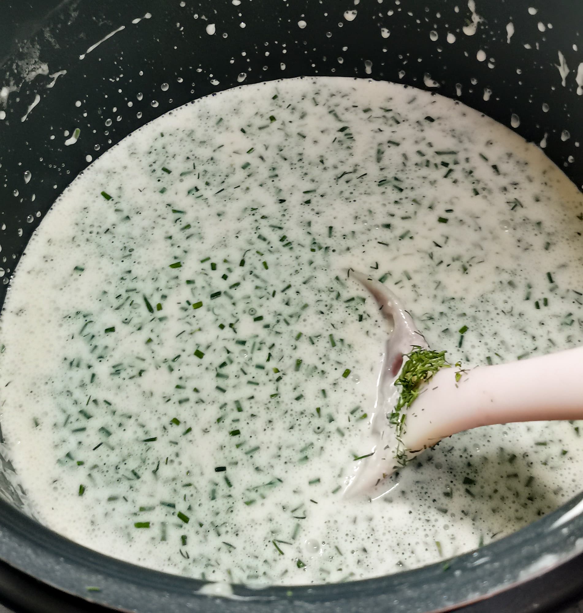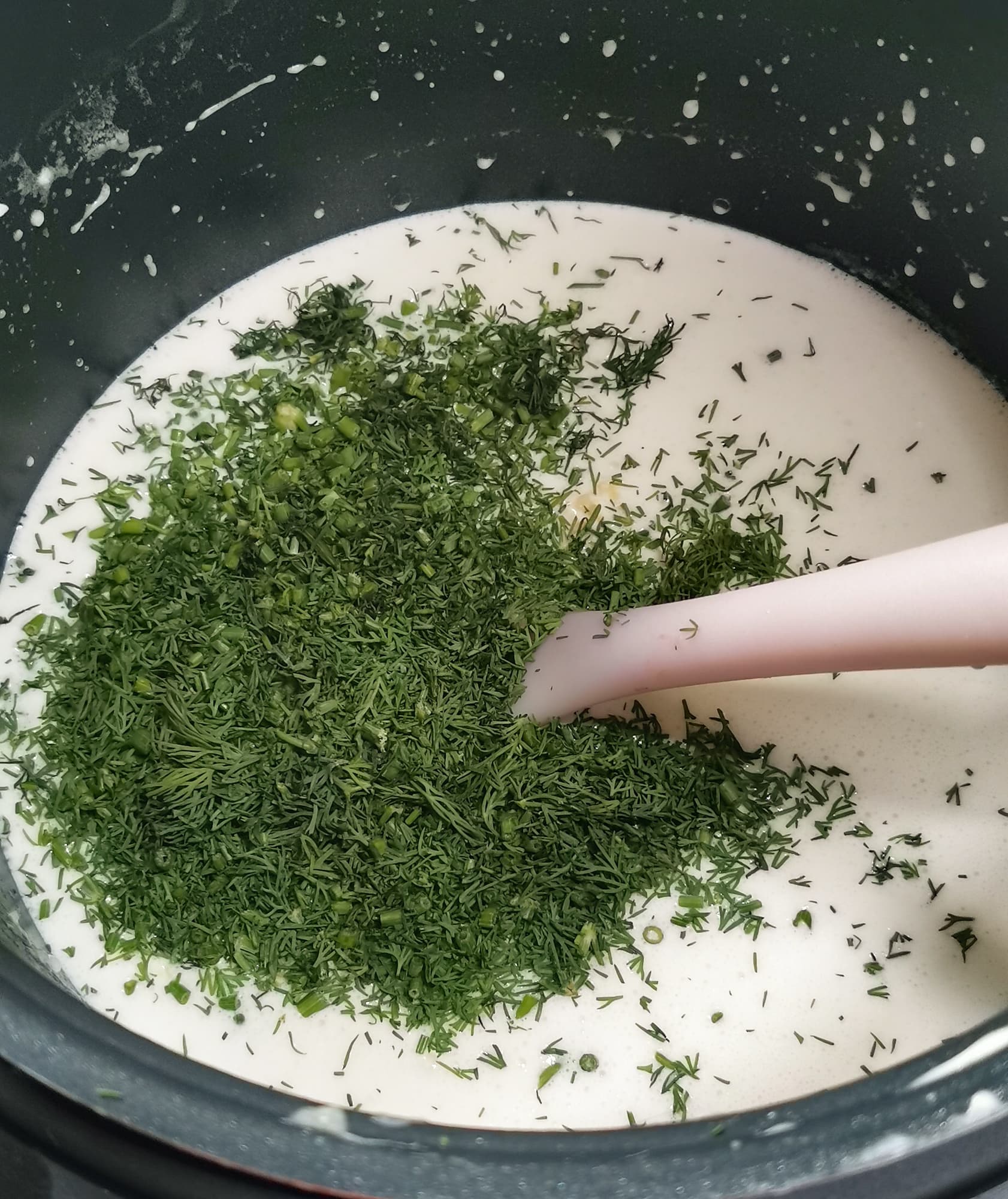 Выставили температуру 75 °C и при интенсивном помешивании добавили в смесь соль и пол чайной ложки соды. После того, как смесь перекипела и стала однородной, всыпали мелконарезанный укроп, острый перец и давленный чеснок.