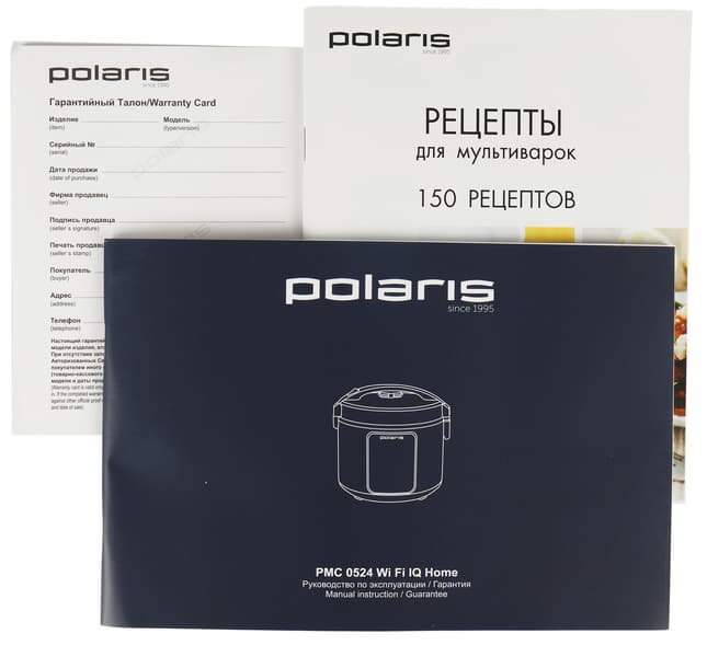 В комплекте к прибору прилагается книга рецептов, гарантийный талон, рекламная книжка приборов системы Polaris IQ Home и довольно объемная инструкция на 3 языках — русском, украинском и одном из тюркской группы. В инструкции, кроме обычной общей информации, мер предосторожности и общих сведений о приборе, имеется подробный разбор дистанционного управления под iOS и Android, таблица для понятия и устранения проблем устройства, таблица программ приготовления, разбор управления мультиваркой с помощью кнопок. Инструкция написана предельно понятно и несет всю необходимую информацию.