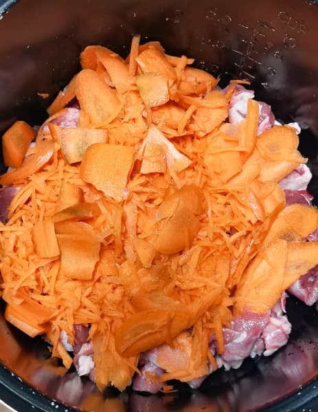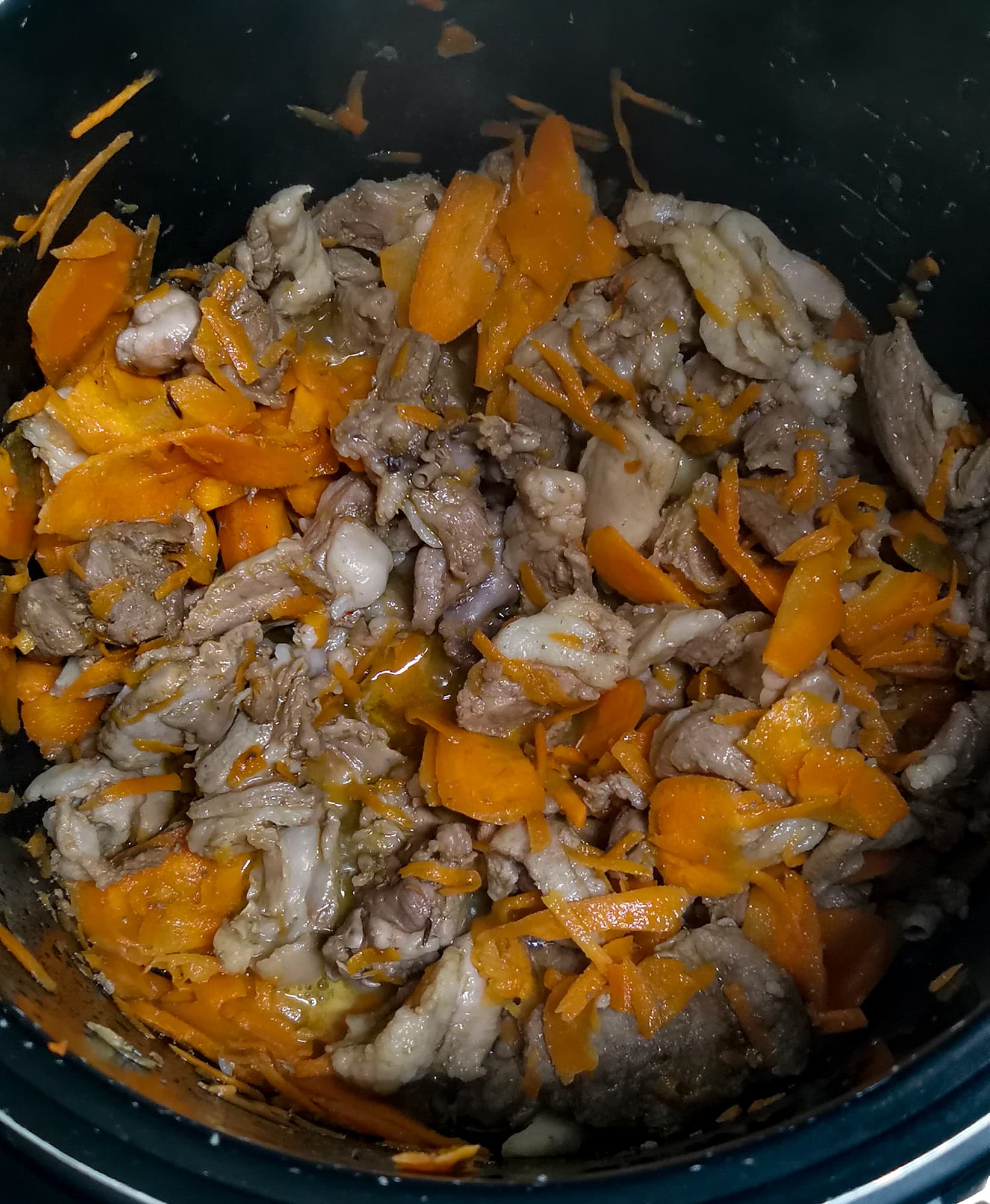 В режиме «жарка» обжарили мясо с морковью до полного выпаривания сока, добавили зиру и соль, жарили еще пару минут.