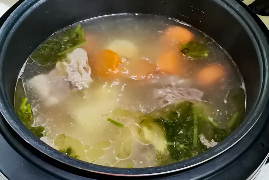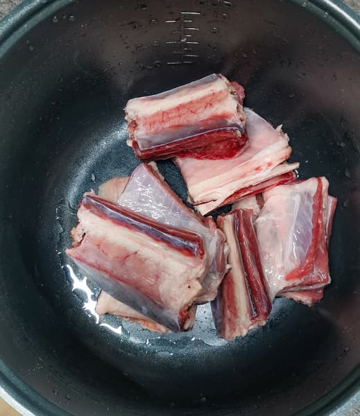 Мы взяли свежие ребра, промыли, положили в чашу, залили водой, выставили режим суп, изменив предустановленное время на 2 часа.