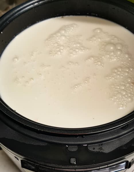Для домашнего сыра мы взяли 4 литра фермерского свежего молока, вылили в чашу мультиварки, и так как бактериальной закваски у нас внезапно не оказалось, положили в молоко 100 г сметаны. Оставили в мультиварке на ночь при температуре 35 °C.
