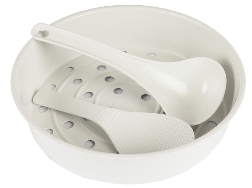 В комплект входит поддон из пластика для приготовления на пару́ и две ложки, плоская и глубокая. С их помощью удобно перемешивать продукты в чаше, не боясь повредить антипригарное покрытие.