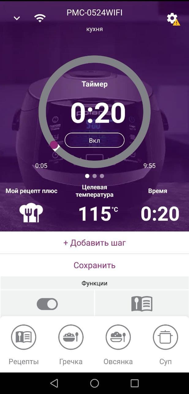 Приложение пополняется новыми рецептами, но и на данный момент в нем очень много интересных подробных рецептов с разным уровнем сложности. Управлять прибором с помощью приложения можно после того, как его освоишь, но интуитивно оно не очень понятно. Например, на горячих клавишах есть только три режима — гречка, овсянка и суп, в которых, к тому же, нельзя поменять температуру. Для того, чтобы выставить нужную температуру и время придется создавать «персональный режим» через «рецепт+». В многочисленных рецептах приложения температура вообще не указывается, только действия пошагово и длительность шагов. То есть, повозившись с приложением, вполне можно приноровиться и быстро устанавливать нужные параметры, но без подготовки сразу это вряд ли получится.