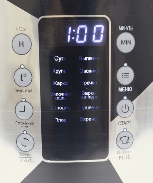 По бокам дисплея расположено 8 кнопок управления: старт, отмена, отложенный старт, меню, установка температуры, установка времени (часы и минуты отдельно), мой рецепт+. Для того, чтобы запустить стандартные программы нужно нажимать кнопку «меню» перебирая с помощью нее все программы по порядку. Для создания своей программы с уникальным временем и температурой нужно нажать «мой рецепт+» и с помощью кнопок «t», «H» и «min» установить нужное время и температуру. Порядок установки всех параметров подробно описан в инструкции. При установке нужно учитывать, что обратного шага нет, температура и время устанавливаются только в сторону увеличения. Если пропустил нужное значение, приходится нажимать по кругу.